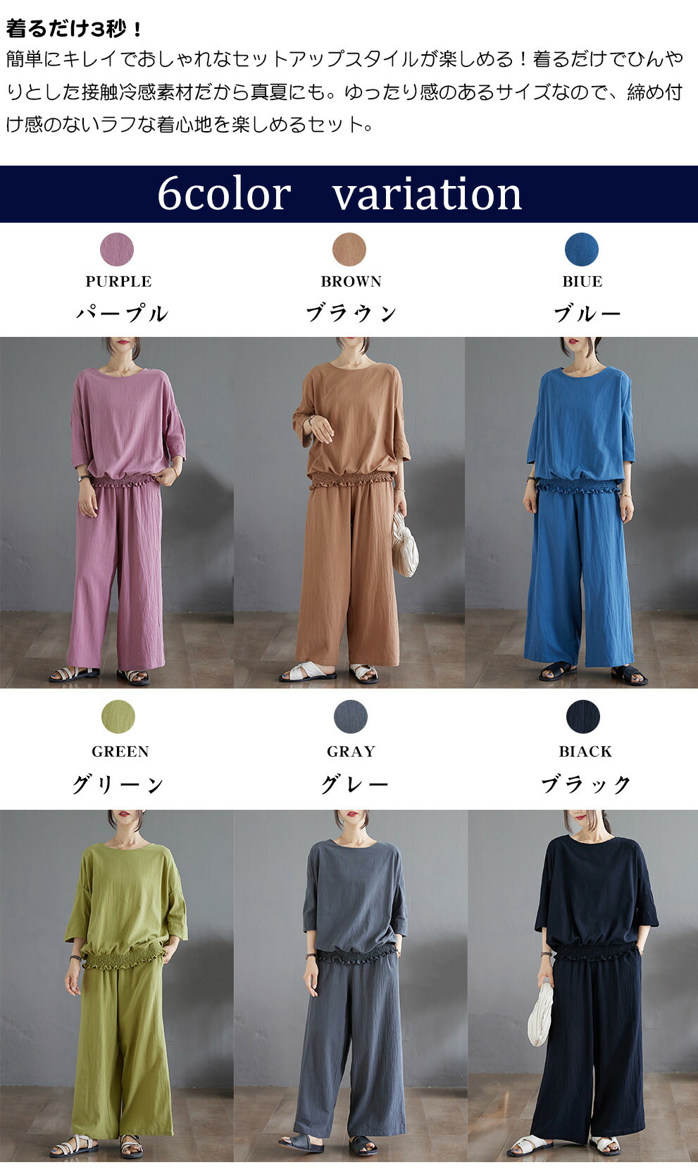 ひんやり涼しい接触冷感機能がセットアップで登場 レディース セットアップ 涼感 リラックス 体形カバー パンツ ラフ 楽ちん ゆったり ワンマイル イージーパンツ ルームウェア きれい