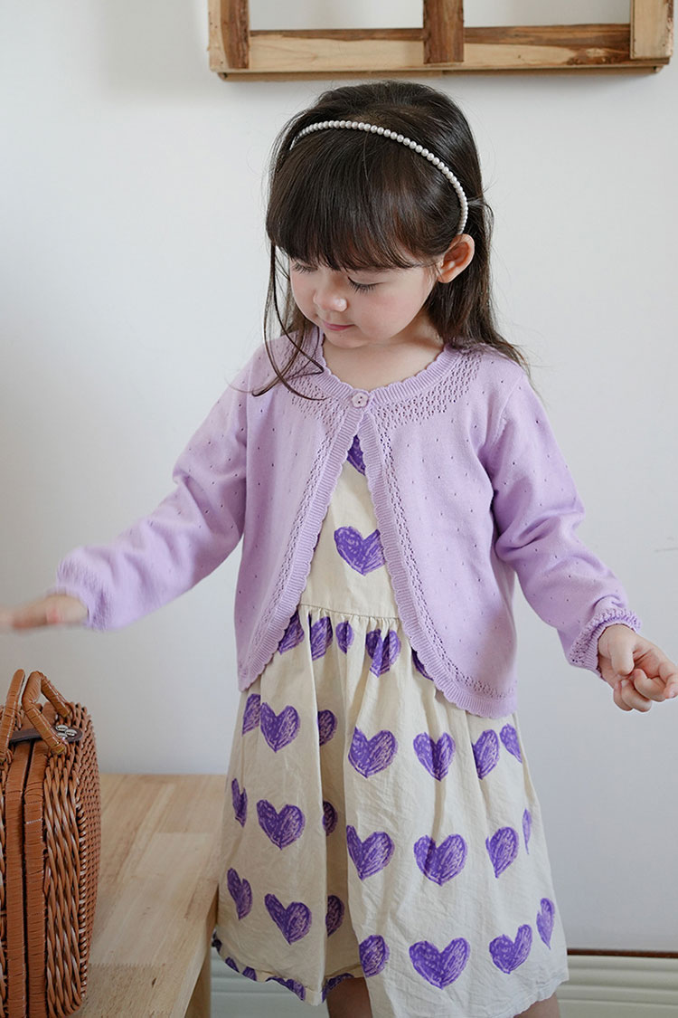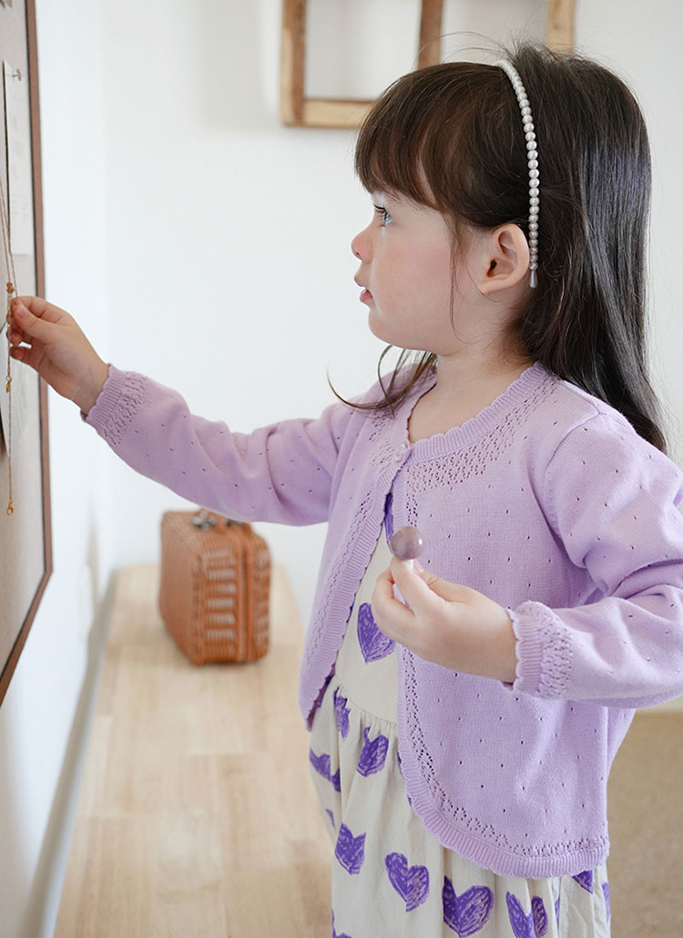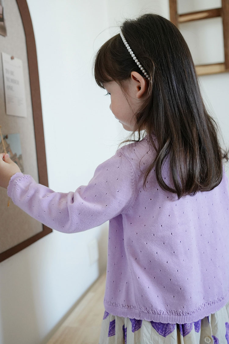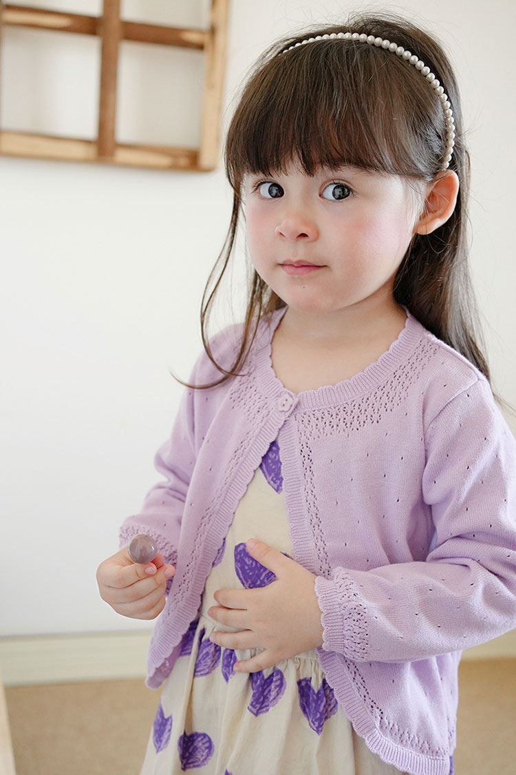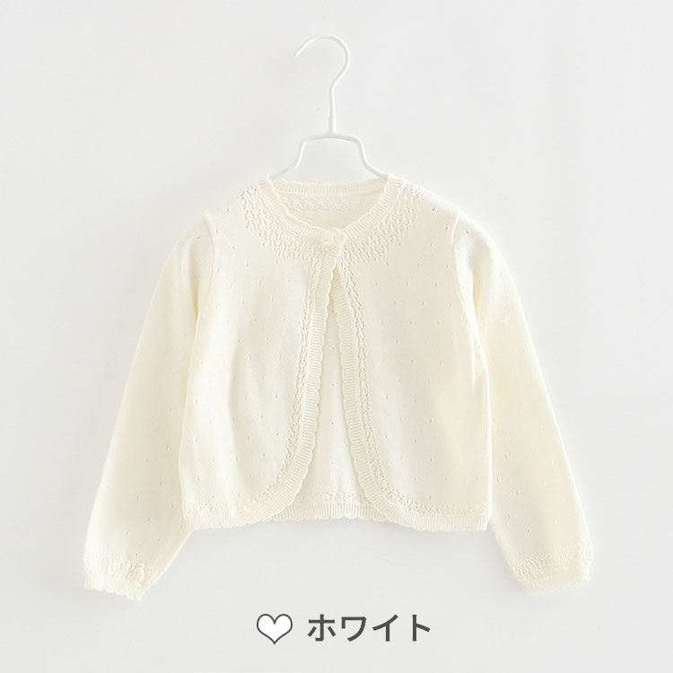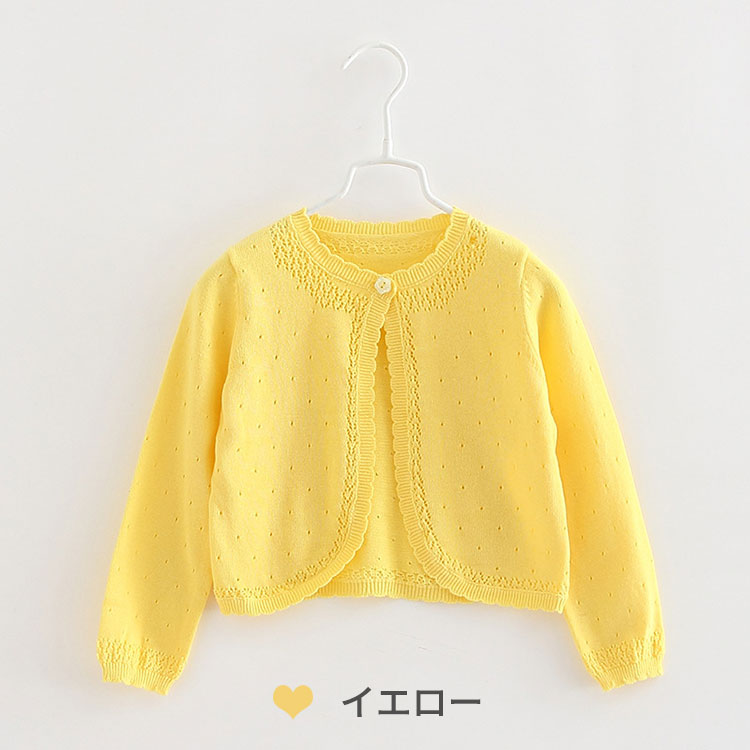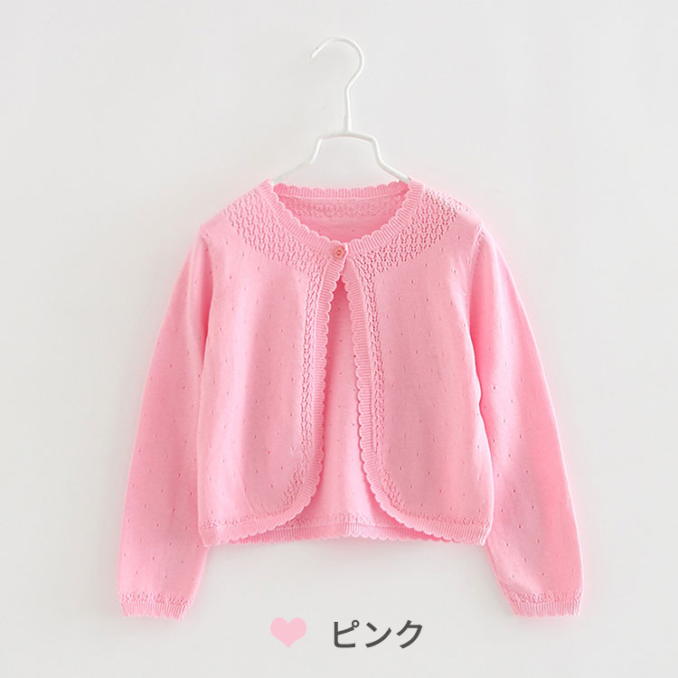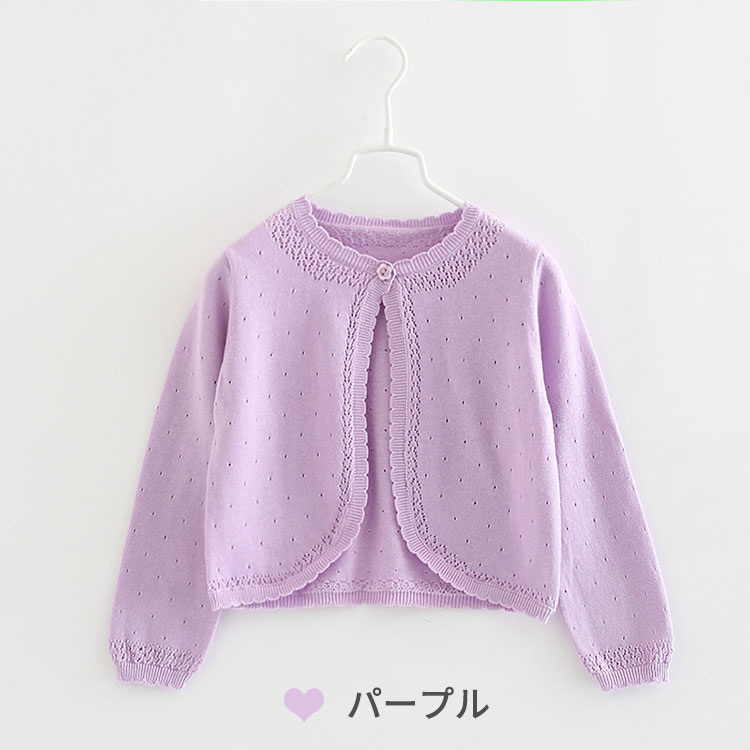 ・透かし彫り編み、薄手で軽いので、春秋はもちろん、涼しい夏の日も冷房のある場所でも快適な着心地を楽しめます。朝晩は冷える季節、防寒機能としてもとても重宝しております。四季にも活躍し、一枚で可愛く仕上がる可愛い女の子用のカーディガンです。