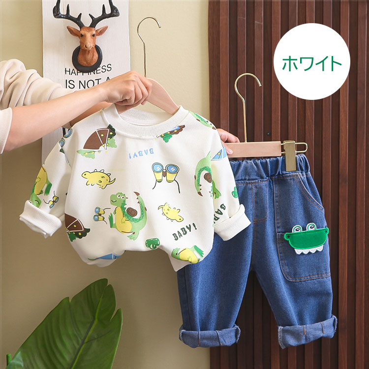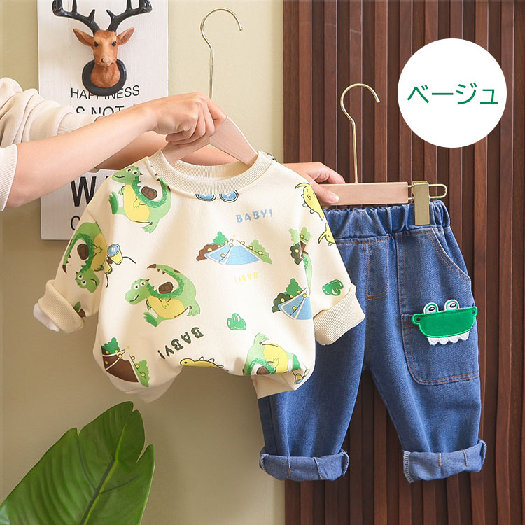 男の子 恐竜柄 上下セット 子供 ベビ キッズ スーツ カジュアルセットアップ カジュアルパンツセット 35%Off ホワイト ベージュ 80cm 90cm 100cm 110cm 120cm 130cm