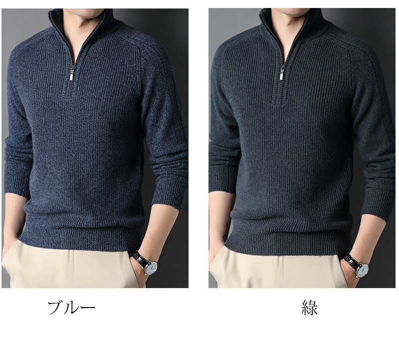 【最大2000円OFF】ニット セーター メンズ ウール100% ハーフジップ ウールセーター 立襟 長袖 ハイネック プルオーバー メンズセーター カジュアル トップス 秋冬 暖かい メンズ ニット 厚手 柔らかい おしゃれ ファッション 父の日 ブルー 紺色 緑 黒 M-3XL