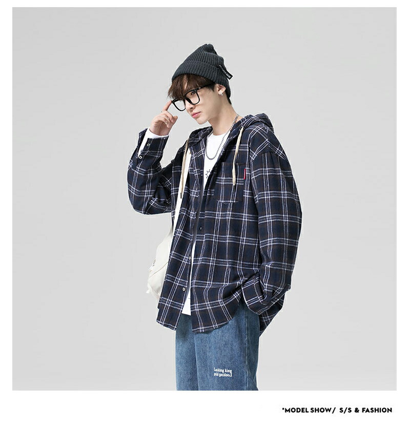 シャツ メンズ 長袖 チェックシャツ フード付き ゆったり 秋服 オーバーサイズ 帽子付 春秋 ギンガムチェック カジュアルシャツ パーカー ビックシルエット 綿 shirt 通勤 通学 高校生 スト