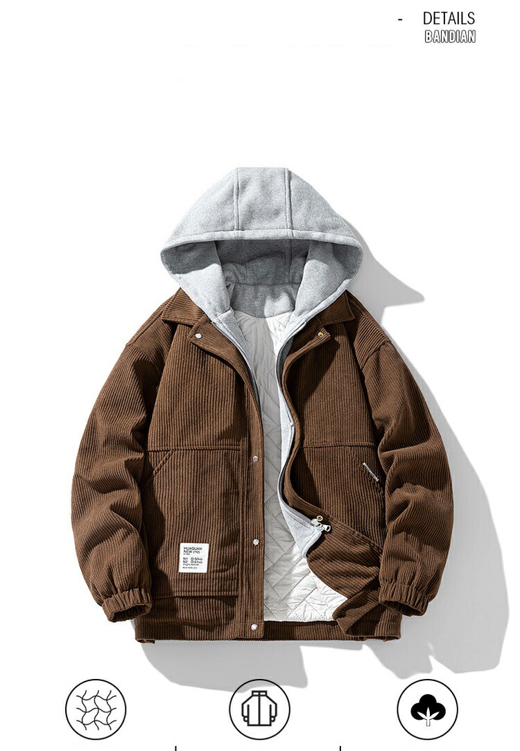 【最大2000円OFF】コーデュロイコート フード付き メンズ ジャケット フェイクレイヤード 中綿入り 暖かい 防風 アウター カジュアル 中綿コート 厚手 ショート丈 トップス ミリタリージャケット スポーツ アウトドア 冬服 通学 メンズファッション