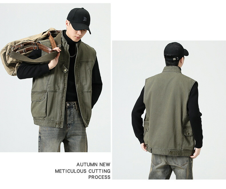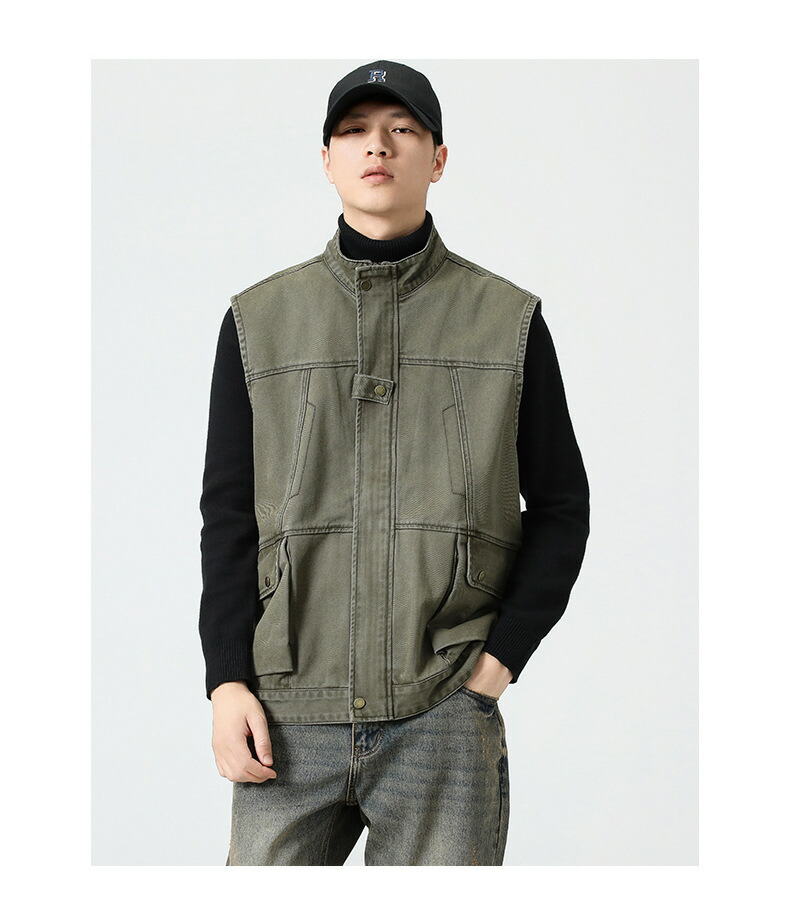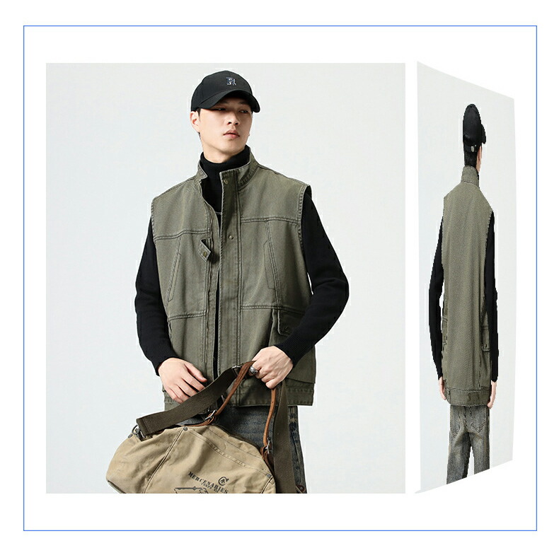 ベスト メンズ 春秋 綿100% 大きいサイズ カーゴ ミリタリー アウトドア 釣り キャンプベスト フィッシングベスト スタンドカラー ファスナー 重ね着 前開き かっこいい ストリート トップス