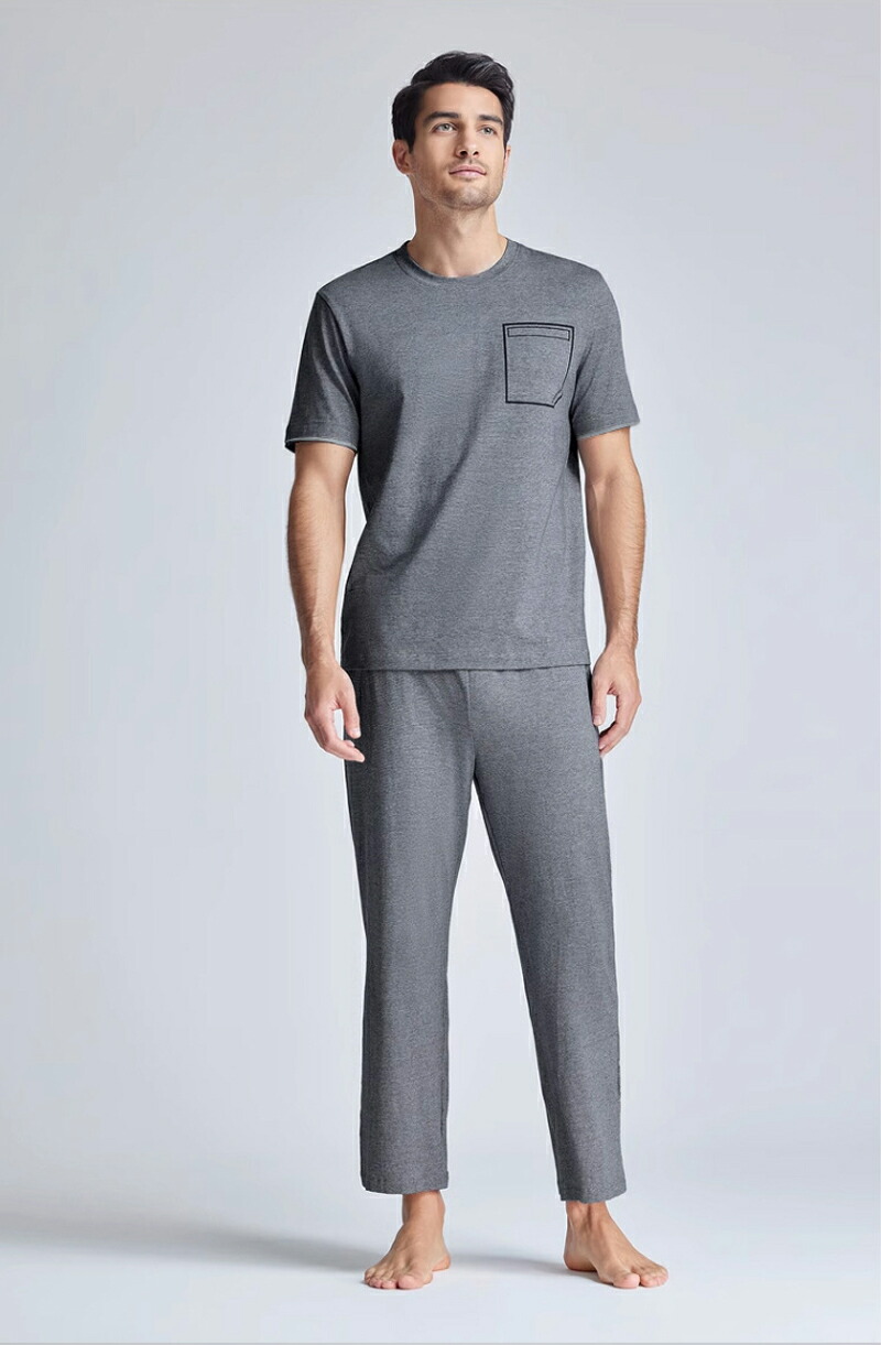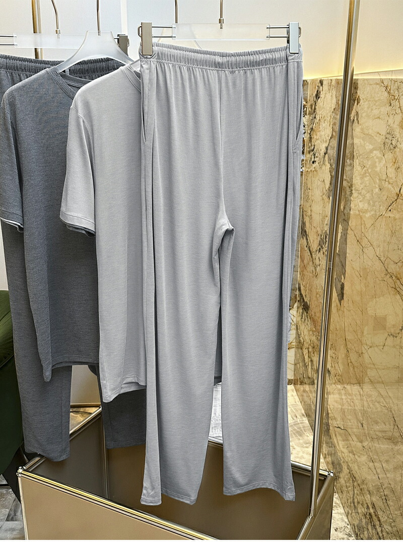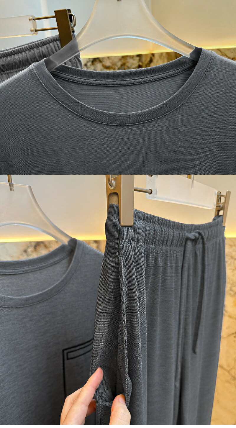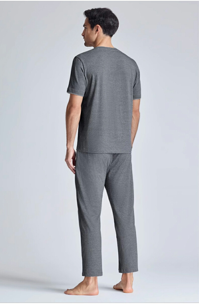 【送料無料】パジャマ 半袖 長ズボン 部屋着 ゆったり 丸首 セットアップ 夏服 寝巻 入院着 ナイトウェア 旅行 着替え 大人用 グレー