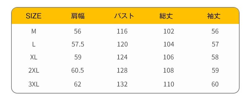 3XL 総丈:110 バスト:132 肩幅:62 袖丈:60