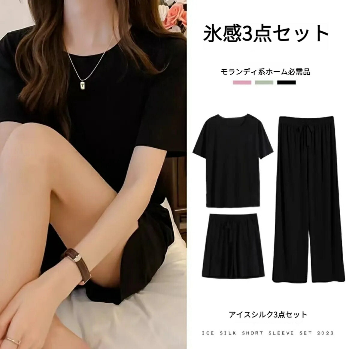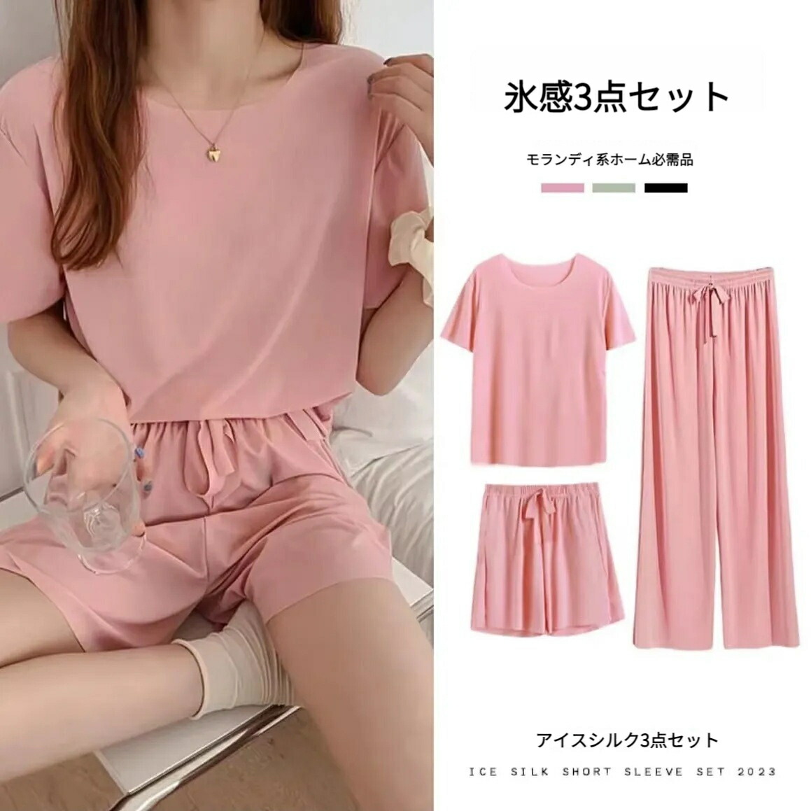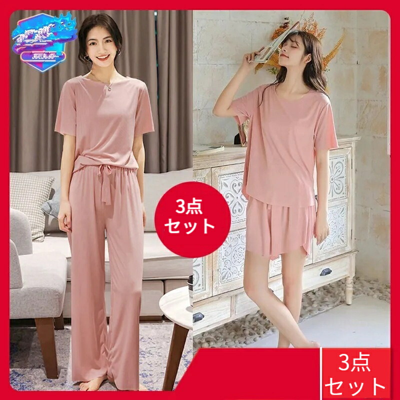 パジャマ レディース 半袖 3点セット レディース ナイトウェア ルームウェア パジャマ 31%Off ブラック グリーン ピンク ブルー イェロー パープル 杏色