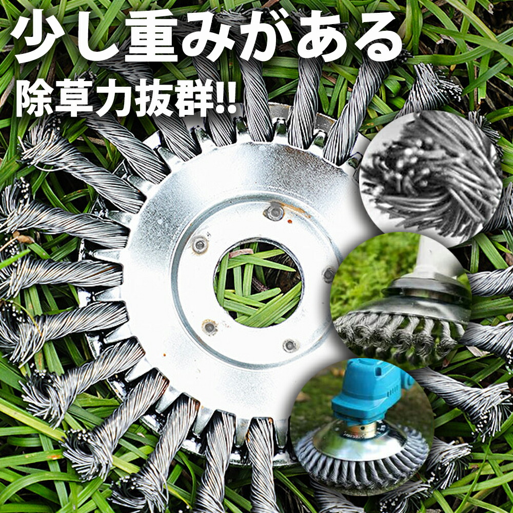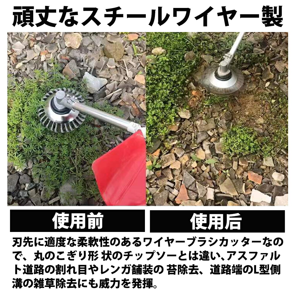商品情報【高品質】 ワイヤーホイールブラシディスクトリミングヘッドは鋼制で、ワイヤーホイールブラシは岩や切り株にぶつかっても簡単には壊れません。ワイヤ素材を使用しているので、研磨や描画後に錆びません。【草刈り機ヘッド】 ガソリン芝刈り機と電働芝刈り機にフィットし、芝刈り機の刃の交換を素早く交換することができます。鋭利なため長期間使用可能です。【取り付け簡単】 草刈機用チップソー丸穴は、草刈り機本体のネジに取り付けられているので、組み立てや取り外しが素早く簡単にできます。取り付けが苦手な方でも問題なく行えます。 具体的な方法は、取付説明書を参照してください。【多機能な使用】 庭や歩道の草刈りに加えて、アスファルト舗装の苔取りやバリ取り、汚れ落としなど、さまざまな場面で優れたパフォーマンスを発揮します。家庭の庭園から公共のエリアまで、幅広い用途で活躍します。【幅広い用途】 このロータリーは、狭い路面角を整えたり、歩道の石や生長物を取り除いたり、砂や砂利の頑固な雑草を取り除いたり、サビやセメントかすを取り除いたり、バリを取り除いたり、研磨用途に最適です。