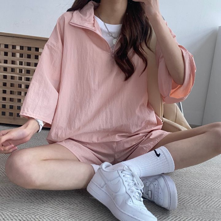 セットアップ 五分袖 ジッパー 上下2 レディースファッション 割引 ブラック ピンク ブルー グレー グリーン ベージュ M L XL 2XL