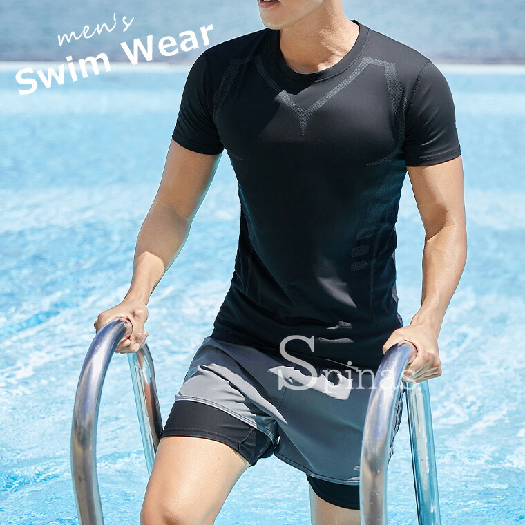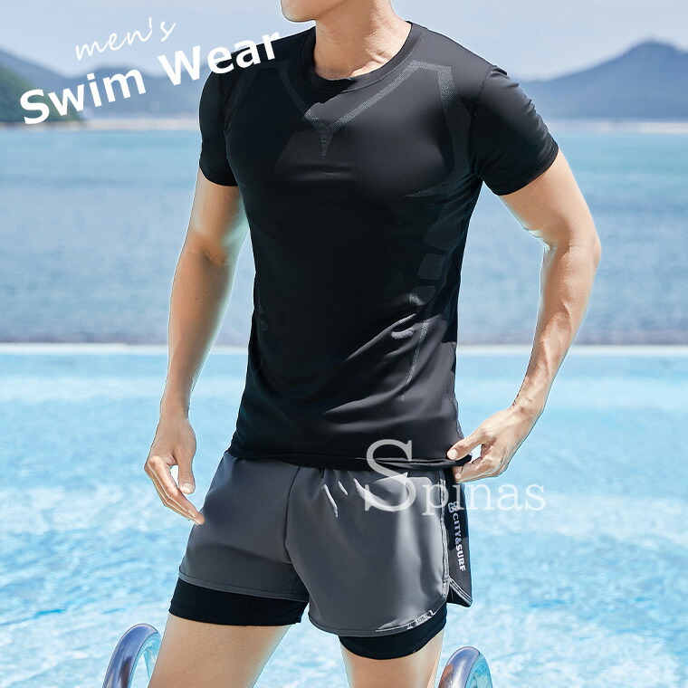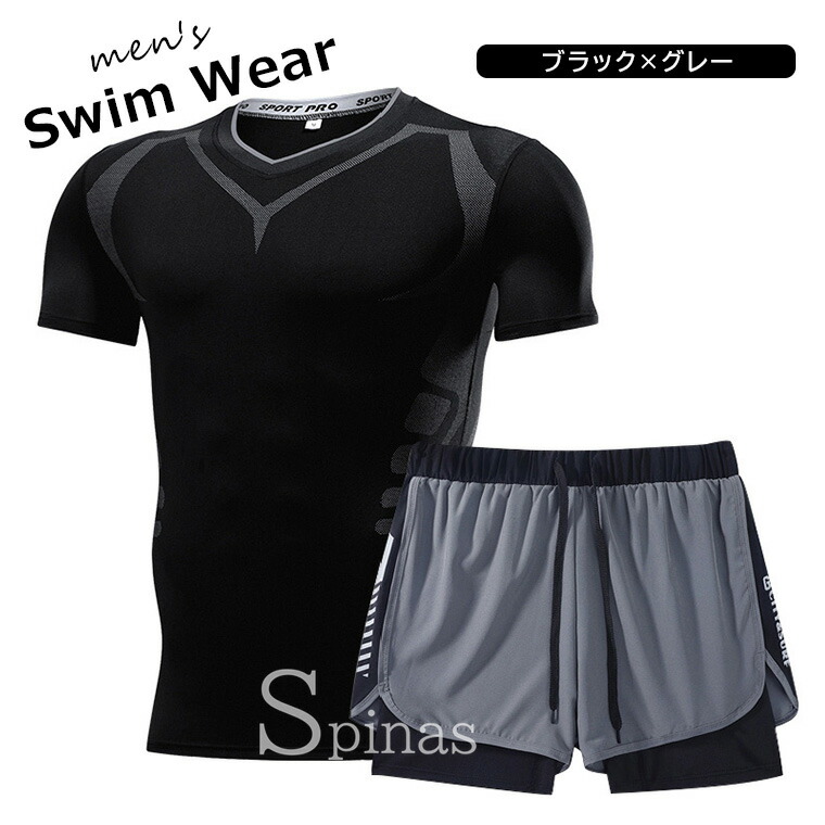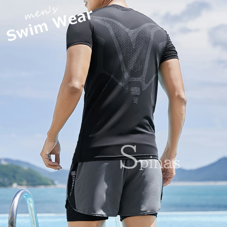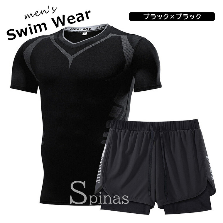 速乾性抜群のフィットネスにもおすすめ!メンズ用水着上下セットのご紹介です♪ メンズ 水着 上下セット 半袖トップス レイヤード風パンツ フィットネス