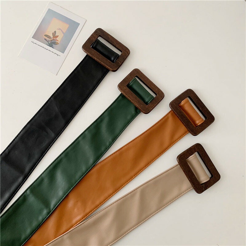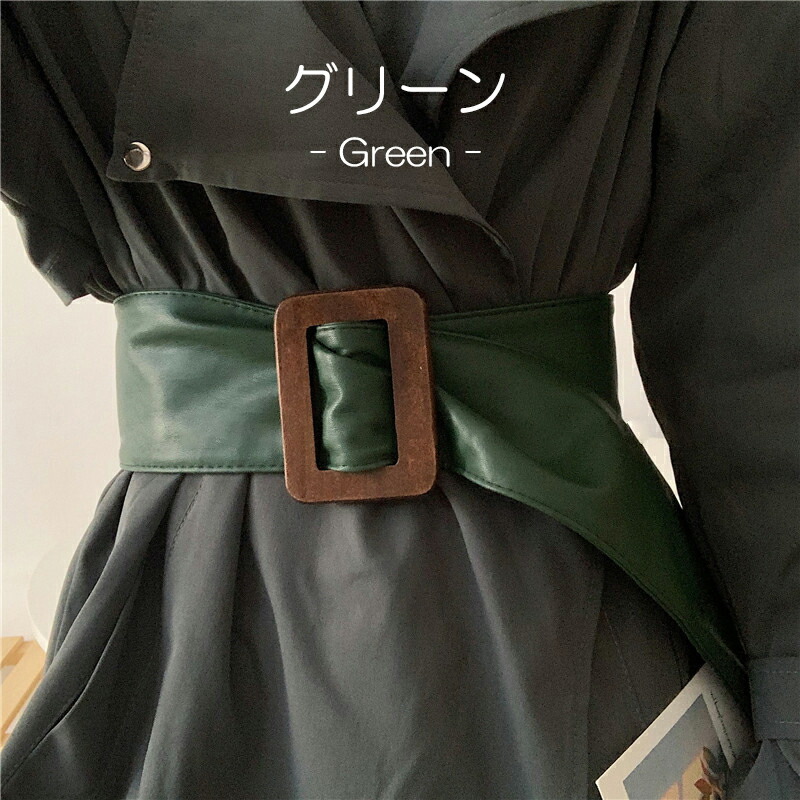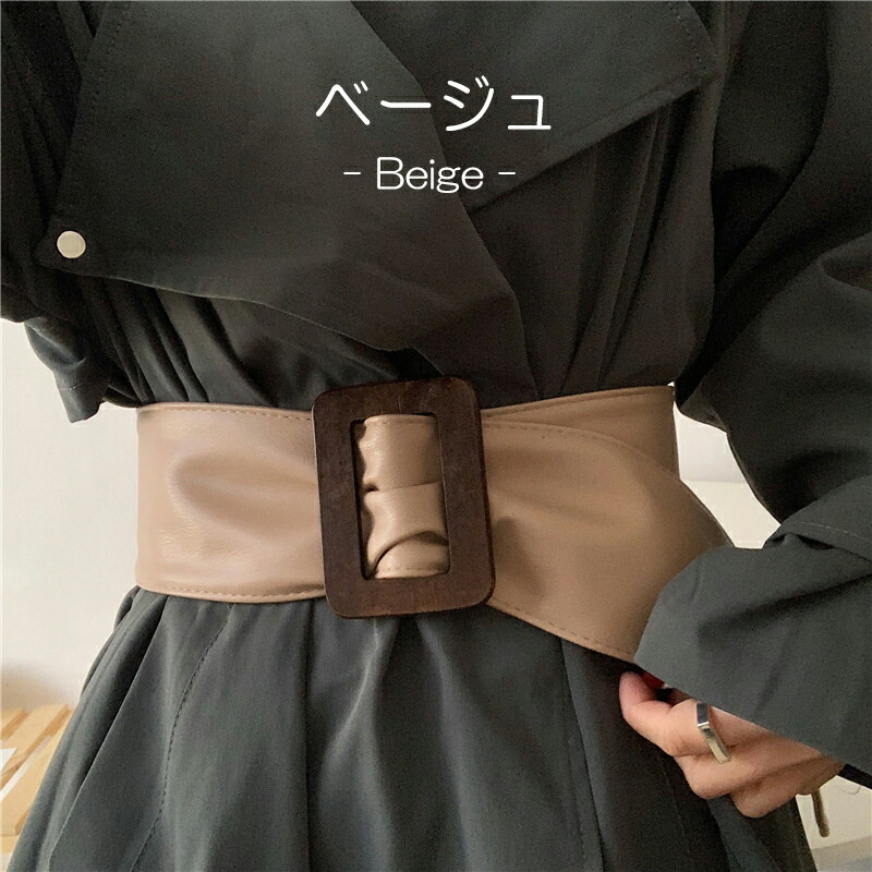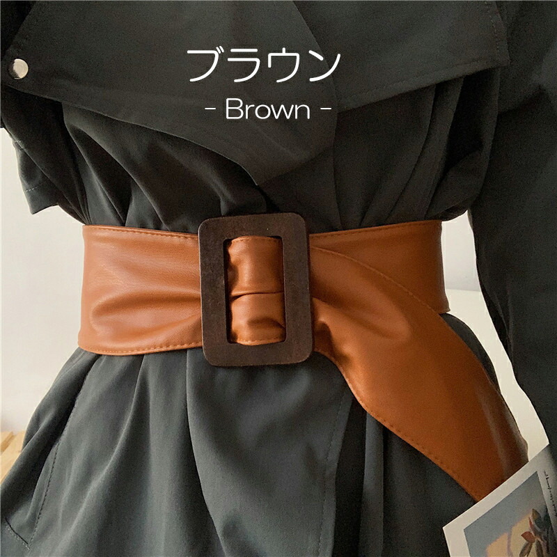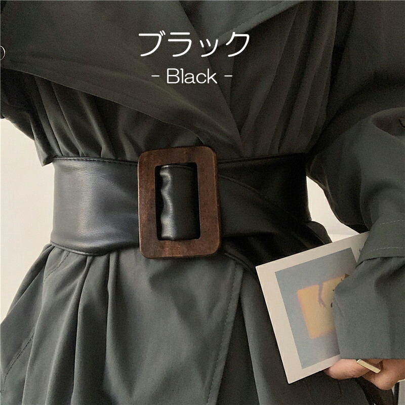ウエスト周りをすっきり見せる 全4色 ウッド調バックル サッシュベルト PU フェイクレザー 太ベルト バックルレス ウエストマーク