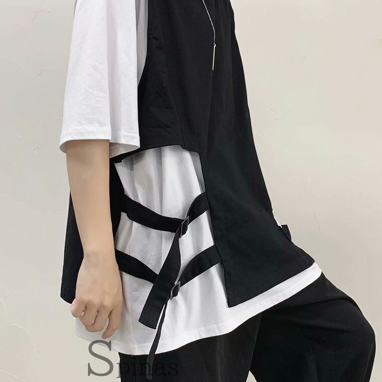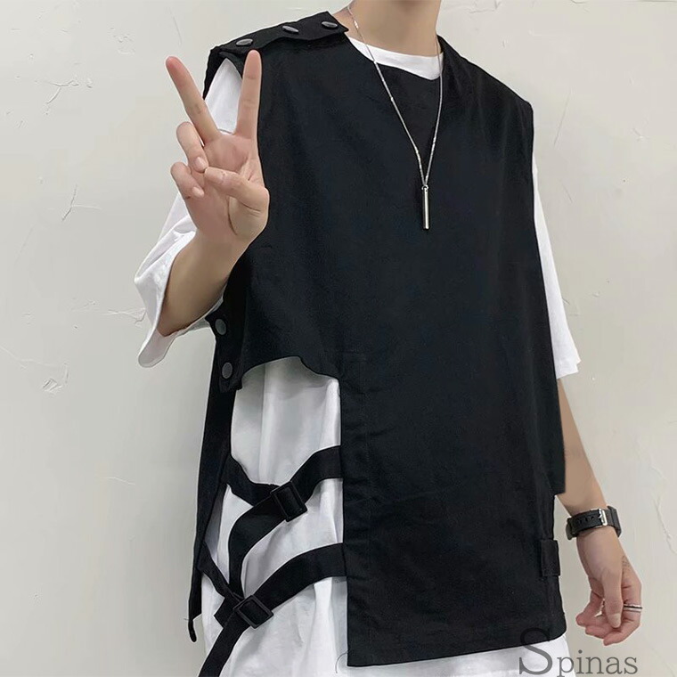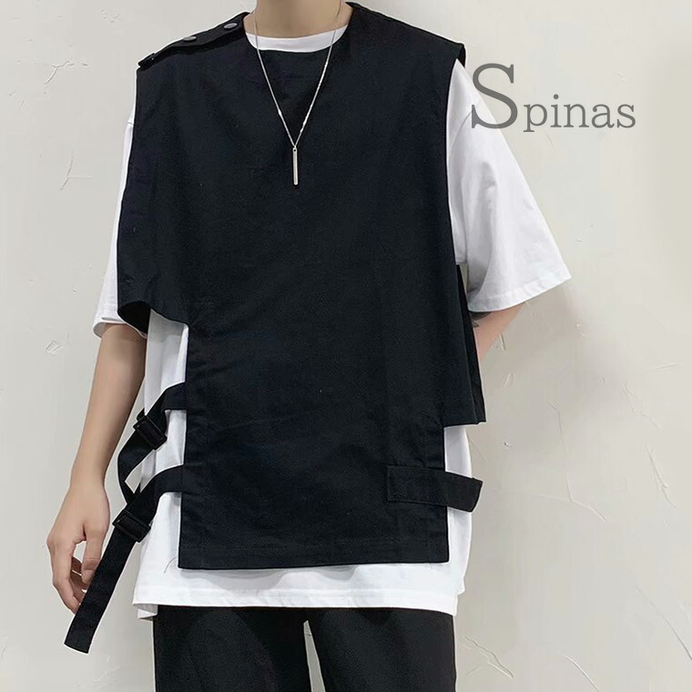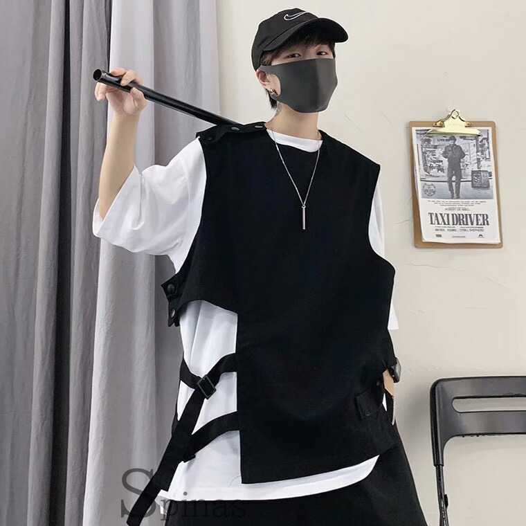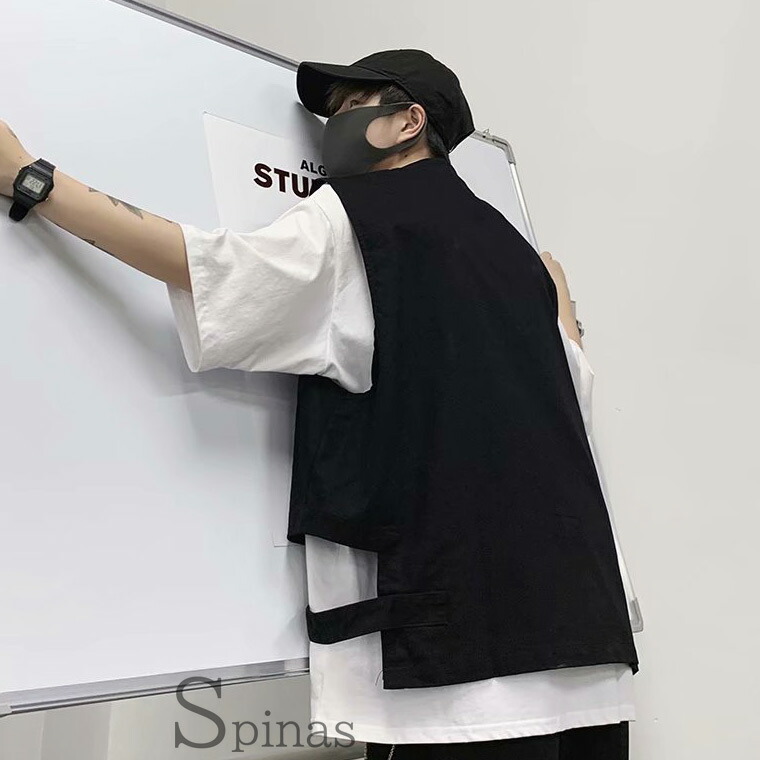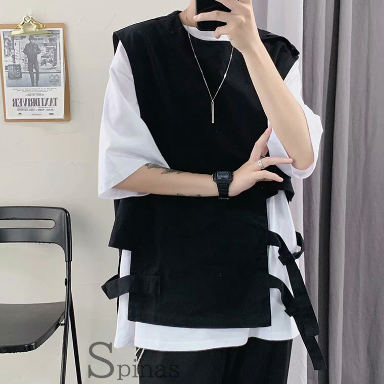 流行りのコーデが簡単に ベスト&白T 2点セット 黒ベスト メンズベスト 重ね着 コーディネート 男性 Tシャツ 白Tシャツ 韓国ファッション