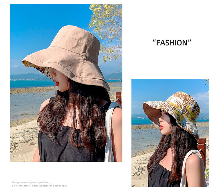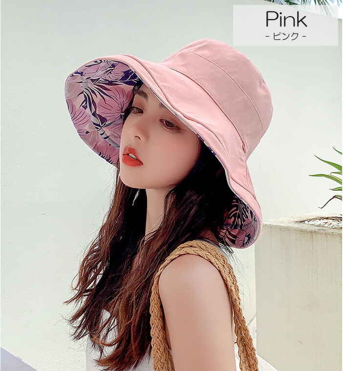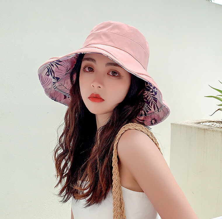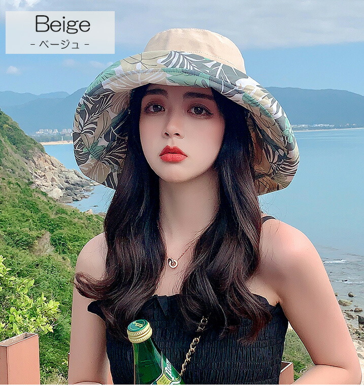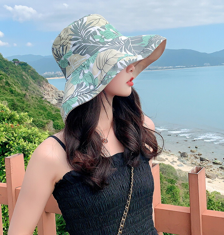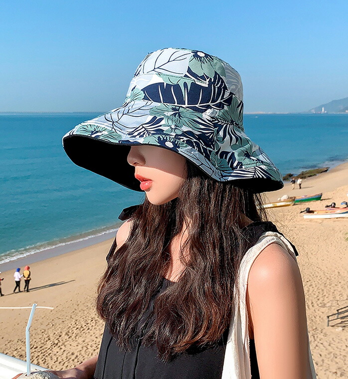 両面とも使える リバーシブル ハット リーフ柄&無地 両面使用 レディース バケツ帽子 ぼうし キャップ 紫外線対策 つば広 日よけ 折りたたみ おしゃれ