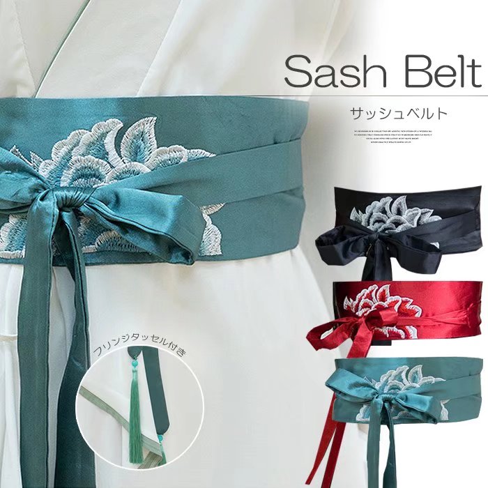 コーデのワンポイントに使える!全3色 フリンジタッセル付き サッシュベルト 光沢感 サテン コルセット ハイウエスト 太ベルト 和柄 着物 帯 ウエストマーク コスプレ
