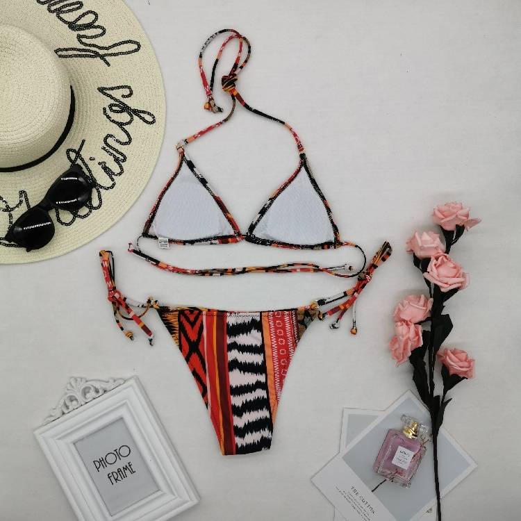 エキゾチックで夏にぴったりなボタニカル柄三角ビキニ。