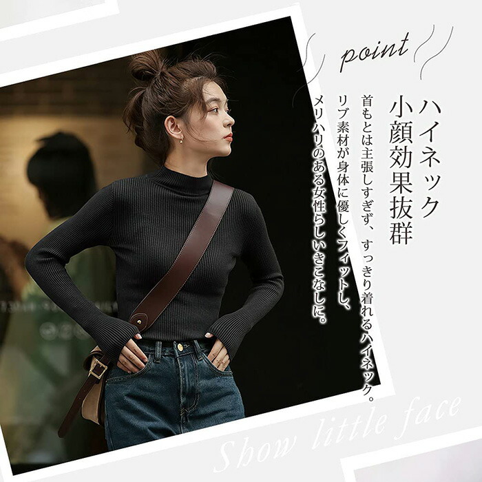 【ハイネック 小顔 暖かい】ハイネックニットのシルエットが、首もとは主張すぎず、すっきり着れて顔周りを小顔に見せてくれます。リブ素材がボディのやさしくフィットし、メリハリのある女性らしい着こなしになります。また。ハイネックは高すぎず、素材も柔らかいので首周りは絞めつけもなく暖かく心地いいです。