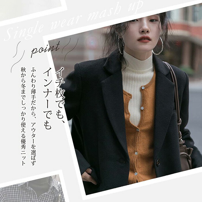 【程よい厚さ秋口から春先まで】程よい厚みのニットセーターで、一枚着ても、インナー使いにしても活躍するリブニットです。メインとしてはもちろん、シャツやワンピースなどのインにも使いやすいし、季節の変わり目にはメイントップスとしてはもちろん、冬本番にはアウターの中に着込みやすいのもポイント!すっきりした肩やお袖のシルエットと丈感に設定されていますので、キレイめスタイルやオフィスシーンにも使えます。