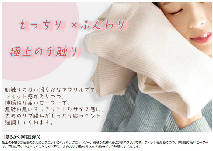【柔らかく伸縮性良い】触っていたくなる「もっちり×ふんわり」。極上の手触りが自慢のふんわリブニットのハイネックニットソー。肌触りの良い滑らかなアクリルです。フィット感がありつつ、伸縮性が高いセーターで、無駄の無いすっきりとしたサイズ感に、太めのリブ編みがしっかり縦ラインを強調してくれます。ボディにはチクチク感の少ない伸縮性抜群のリブ編みニット素材を使用し、伸縮性があるので着脱は楽ちんです。