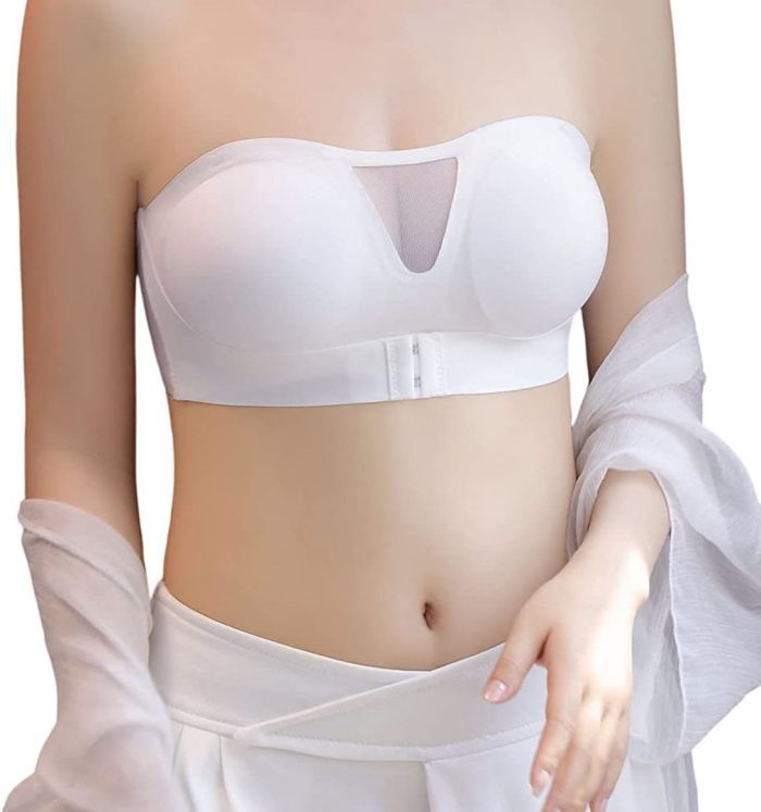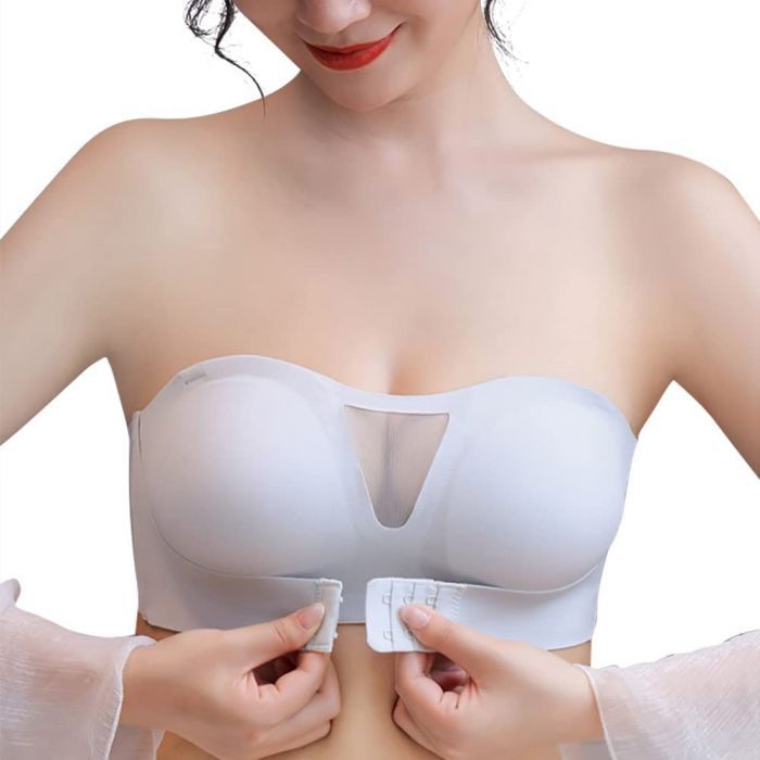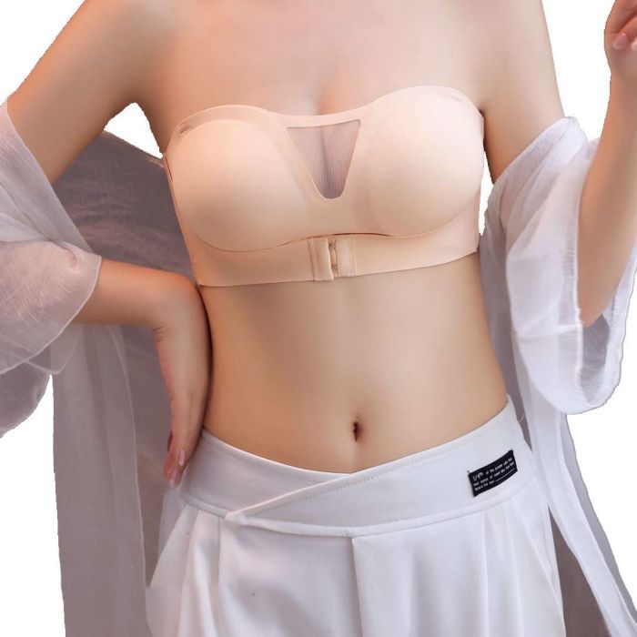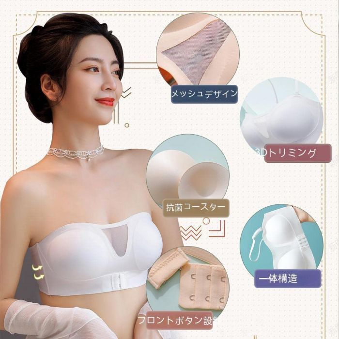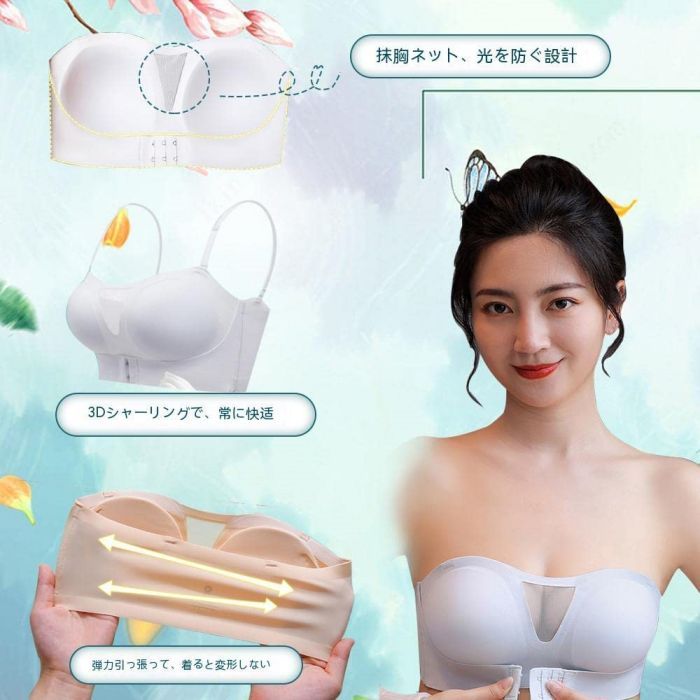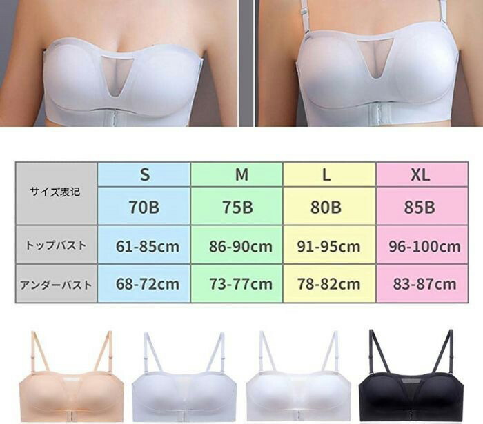 【滑り止めがあり 安定感抜群!】ストラップレスブラのバックの横ベルトに滑り止め加工を施す、胸下にフロントホック付き、激しく動い時の震動軽減ができます。カップ内の盛りパットが十分。マッサージの顆粒付きため、つけ心地が良いです。また胴回りの部分裏についているラバー素材のような滑り止めの効果が絶大。乳房を集めてセクシーにする調節可能なフロントホックデザイン。谷間メイクの同時に安定感もプラス!ダンスで使用してもずれず、思い切り踊れました!