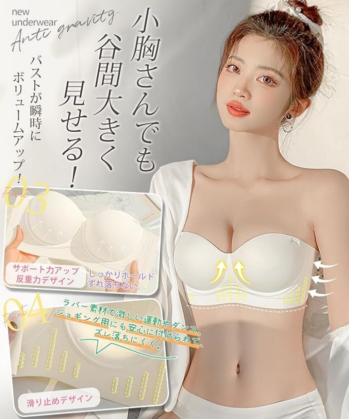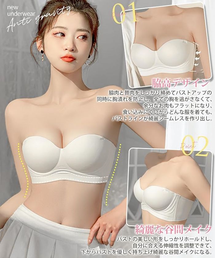 ストラップレスブラ チューブトップ 滑り止めデザイン 脇高 美胸 肌に優しい 締め付け感ゼロ 着け心地良し 高弾性 通気性 取り外れ肩紐 谷間メイク 盛れブラ 紐なしブラ