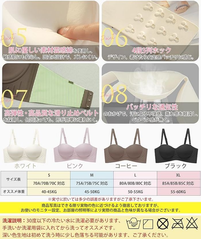【肌に優しい素材 締め付け感ゼロ】AOYのチューブトップは肌に優しい素材雲感綿を使用して、ベストな着用感に感じとともに、薄くてきれいなバストラインに見えます、敏感肌にも安心に着用できチューブトップです。AOYのチューブトップは高伸縮性と柔らかい生地を使って、着けても360度締め付け感ゼロ、肌や肩への負担がなくて、ベストな使用感になるチューブトップです。さらに、チューブトップのアンダーは4段3列ホックを使用し、着けたら安定感バッチリに感じて、家やお出かけ時に一日着けたままに過ごすチューブトップです。