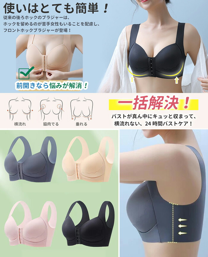ブラジャー 前ホック フロントホック ホールド力 垂れ防止 シームレスブラ 大きいサイズ 前開きブラ 盛れブラ ノンワイヤー ブラ 脇高 伸縮性 補正ブラ 柔らかい 通気性 24時間
