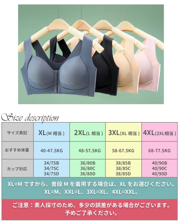 【24時間バストケアブラ】ブラジャーはシンプルなデザインながら、大人可愛い雰囲気に。肌馴染みのよい華やかな波形カットが上品な胸元を演出ブラジャーです。家で着て、出勤して、 して寝ることができます。ナイトブラ、ヨガブラ、ジム、スポーツブラ、ダンス、運動、妊娠ブラと産後ブラ、盛れブラ、寄せブラ、など幅広くお使いいただけ前ホック ブラジャー。素材 ポリエステルカラー 肌色/ブルー/ブラック/ピンクサイズ XL/2XL/3XL/4XLセット内容 前ホックブラジャー