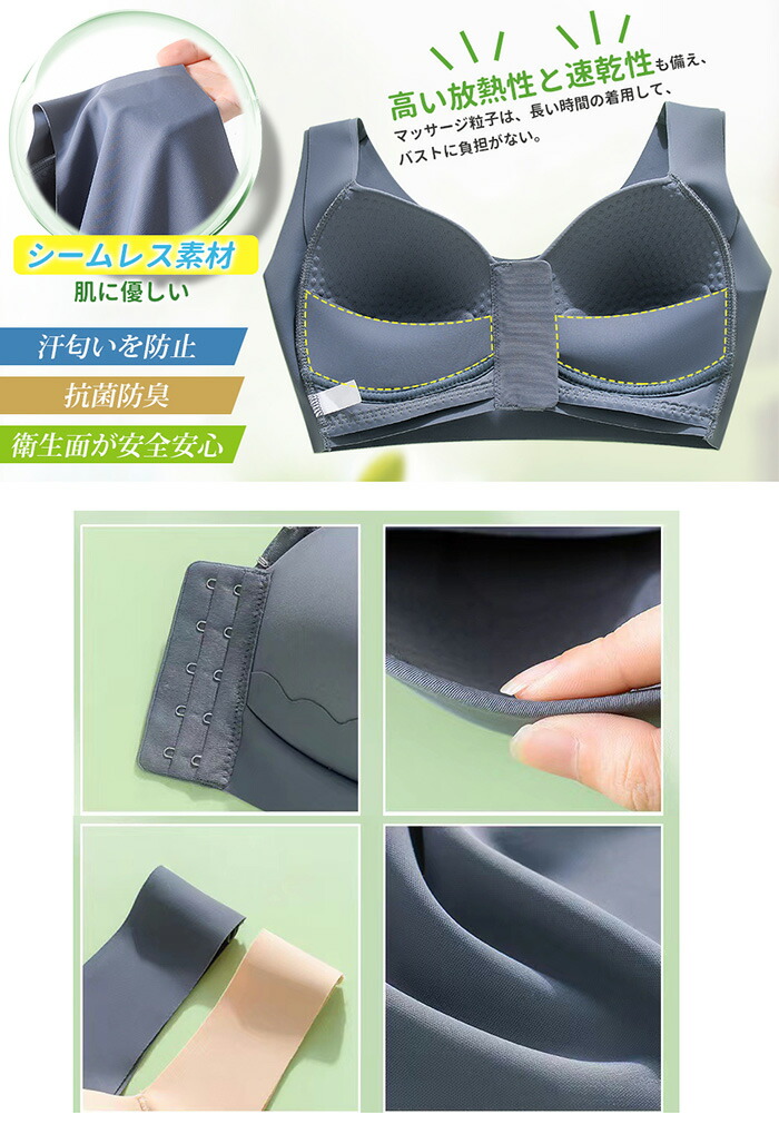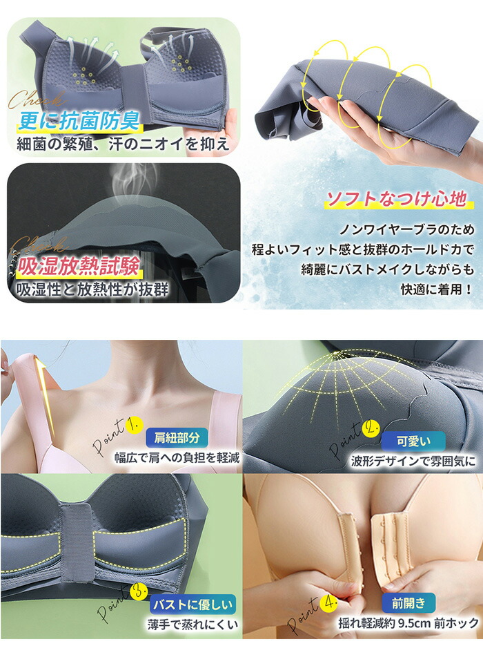 【抗菌防臭蒸れにくい】ブラジャー 前ホック のパッドは薄手通気デザインで吸湿性通気性に優れ。汗をかいてもすぐに吸収し、蒸れ感が減軽、べタつかず。すべり止めのマッサージ粒子は、長い時間の着用して、バストに負担がない。高い放熱性と速乾性も備え、細菌の繁殖、汗のニオイを抑え肌を清潔に保つこともできブラジャー。フロントホックブラのパッドは半月型の内側布を使用ため、前ホックを留めても胸に圧迫感がなく、バストを優しく包み込み、一日中快適!