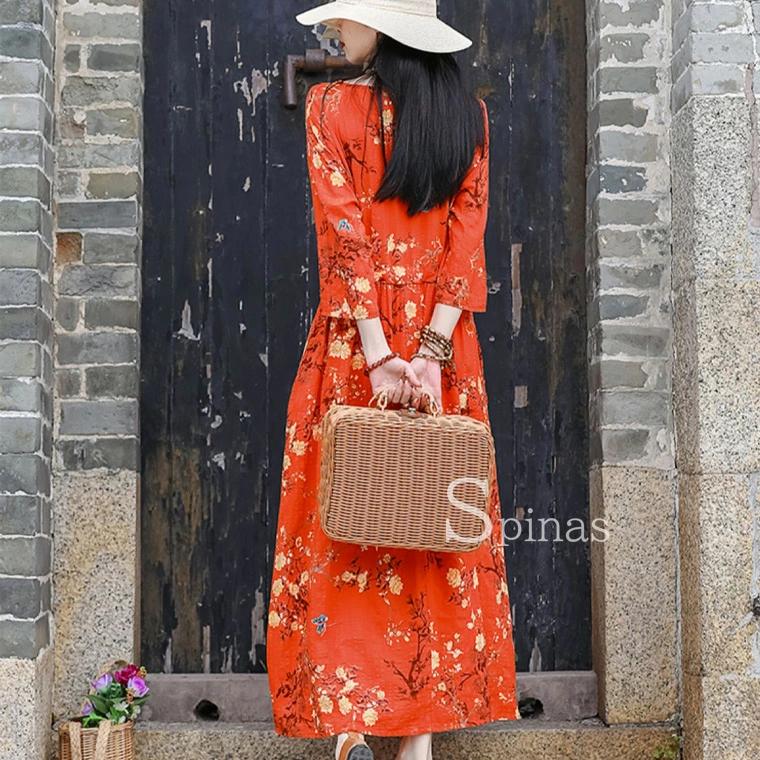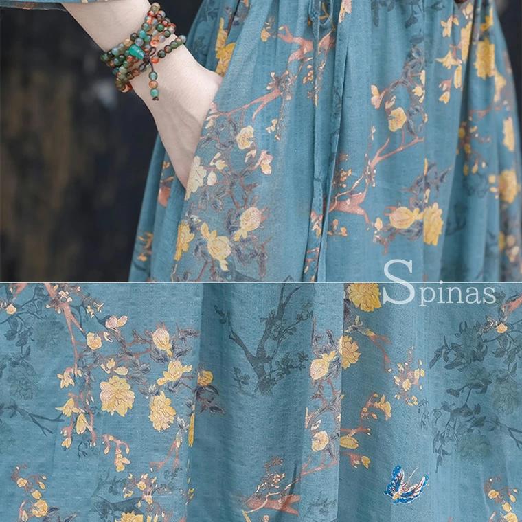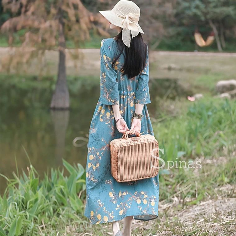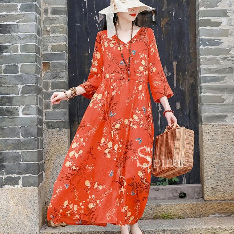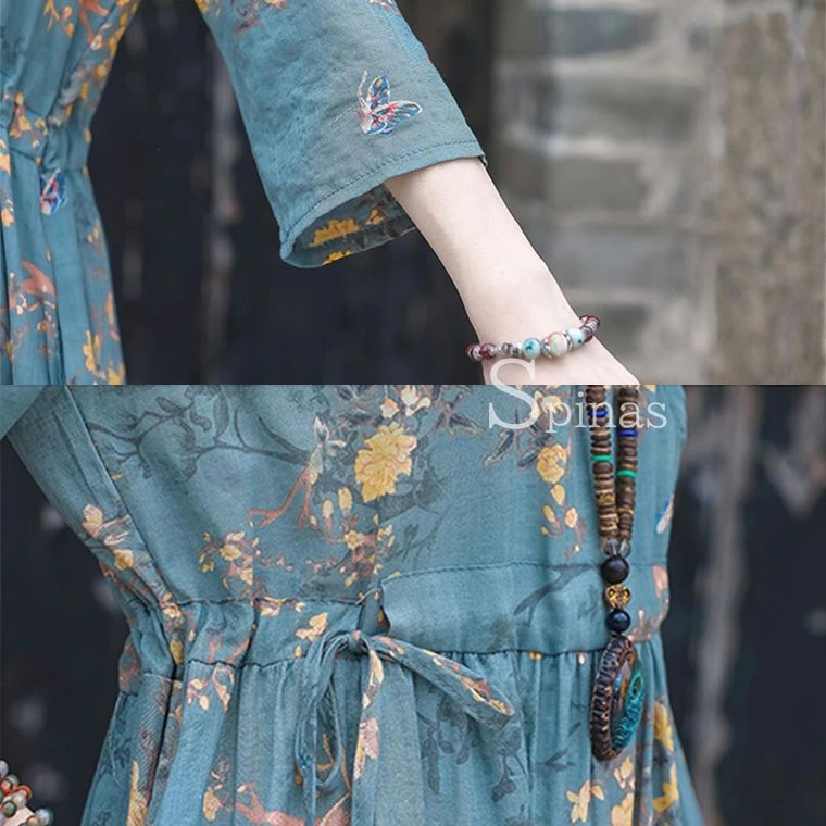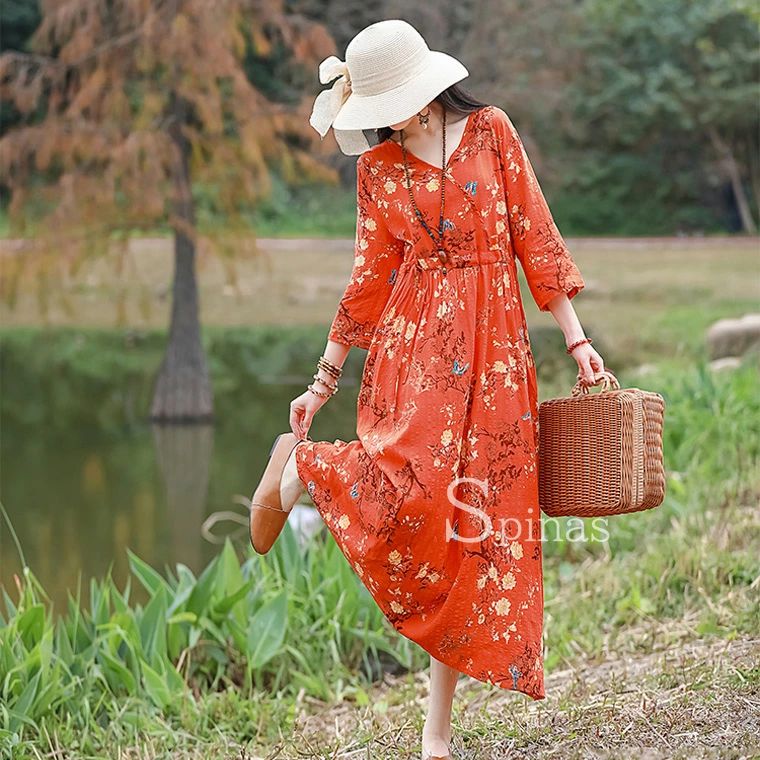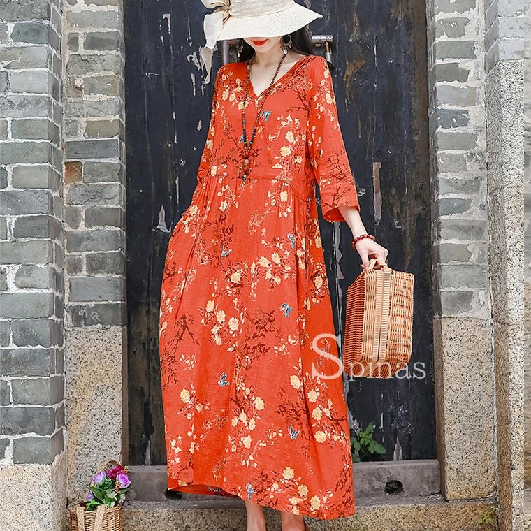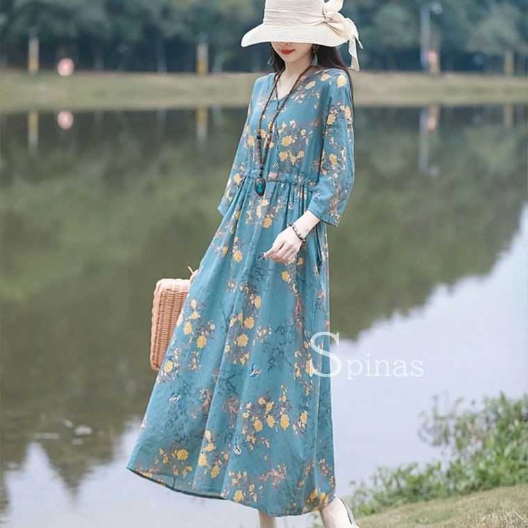 絵画のような絵柄のワンピース 七分袖 レディースファッション 割引 ブルー オレンジ M L XL 2XL