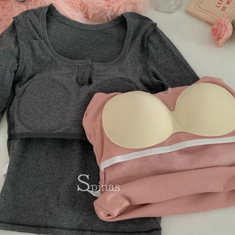 あったか起毛 ヘンリーネック パット付長袖Tシャツ ラウンドネック アンダーフリー ゴムなし ブラトップ 8分袖 9分袖 ロンT 長袖 締め付けない 前のみ パッドのみ 固定 ルームウェア カップ付き
