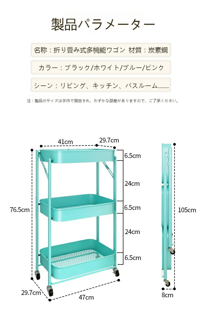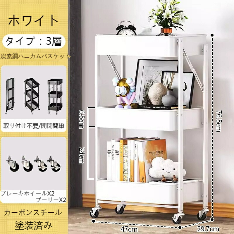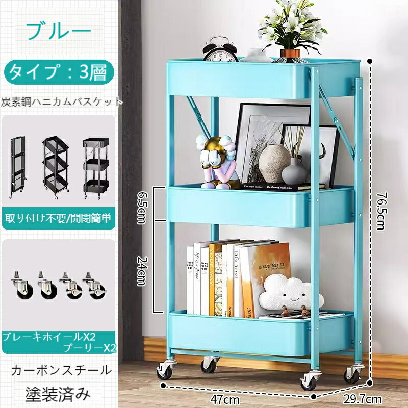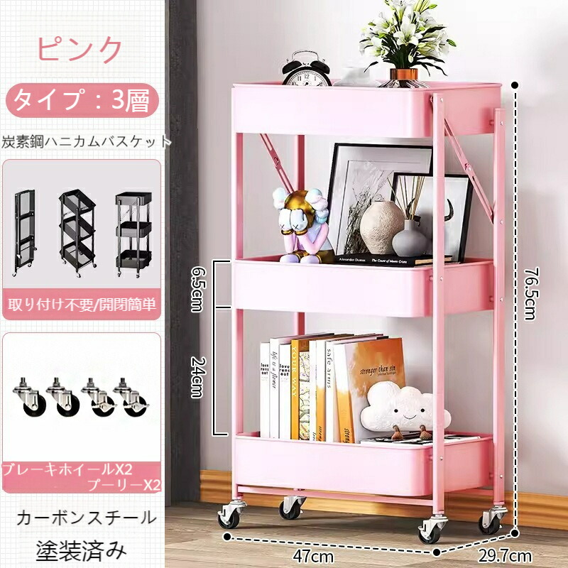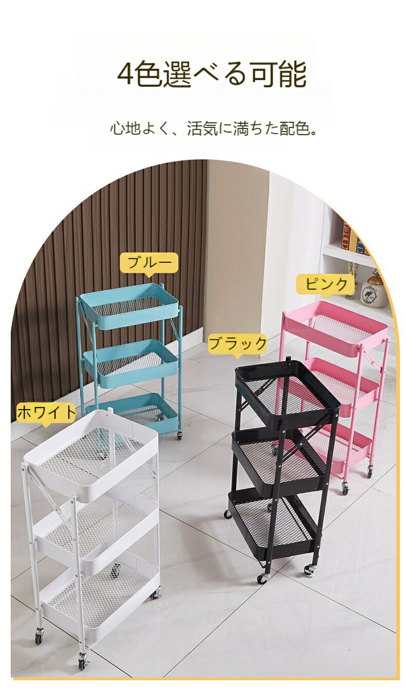キッチンワゴン バスケットラック3段 ホワイト ブラック ピンク ブルー