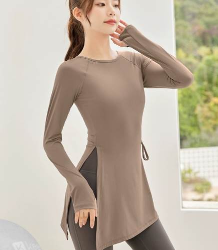 トップス トレーニングウエア 袖付き 長袖 ミディアム丈 プルオーバー 襟なし ラウンドネック 通気性 速乾性 ウエストマーク サイドスリット タイト かわいい シンプル カジュアル 大人 大人可愛い