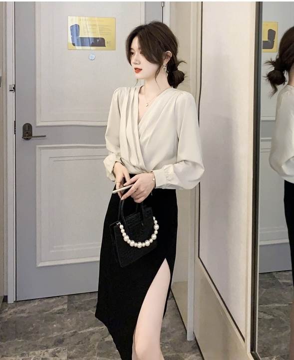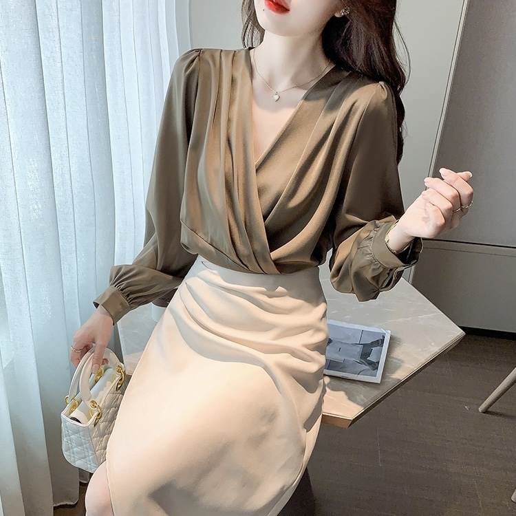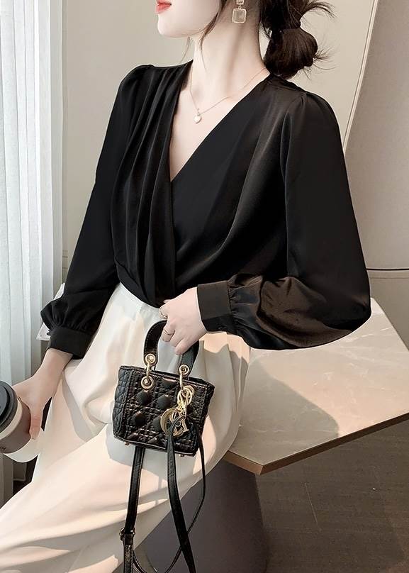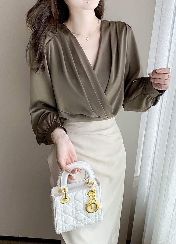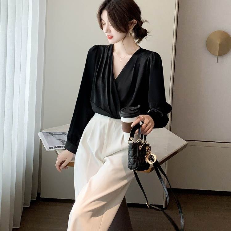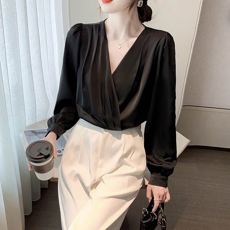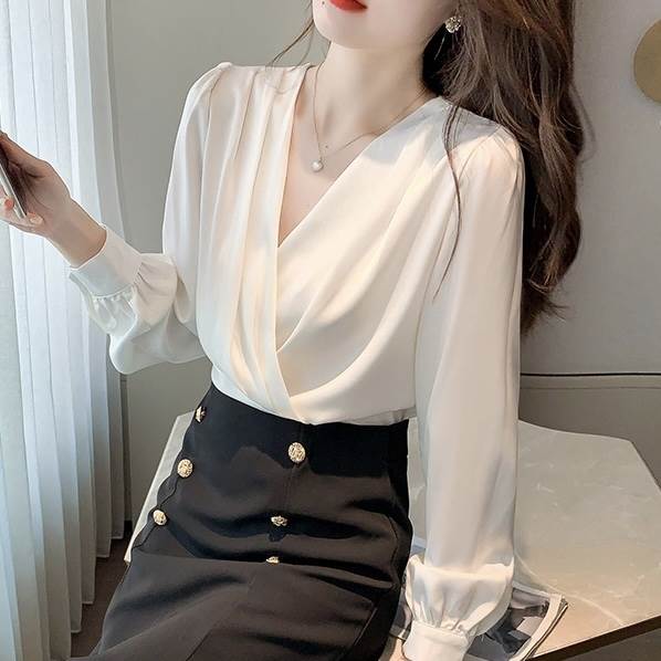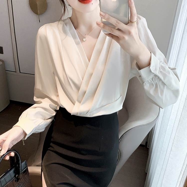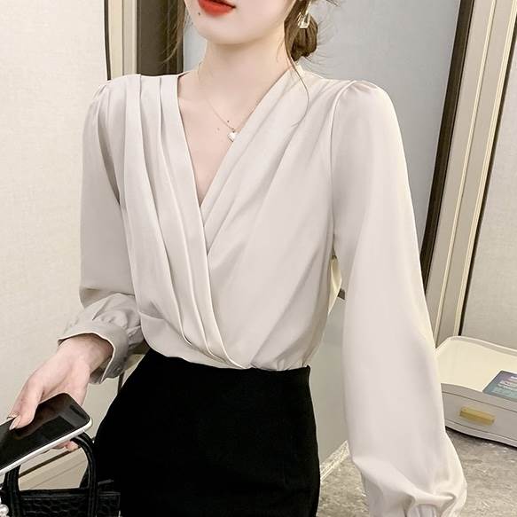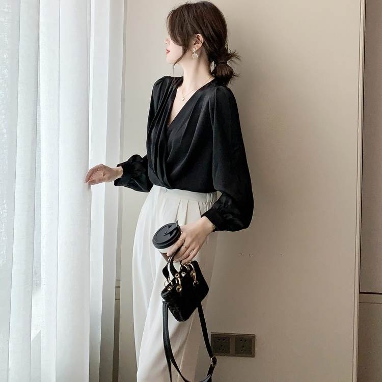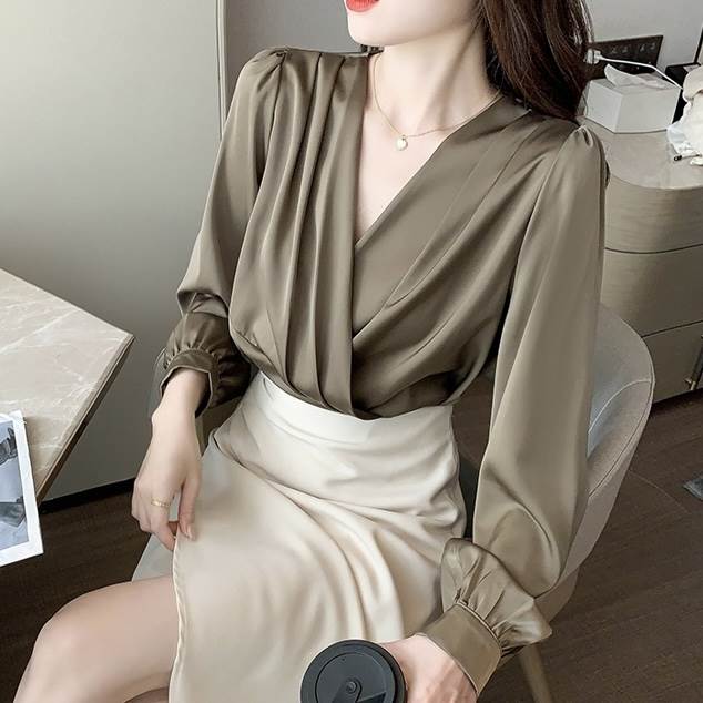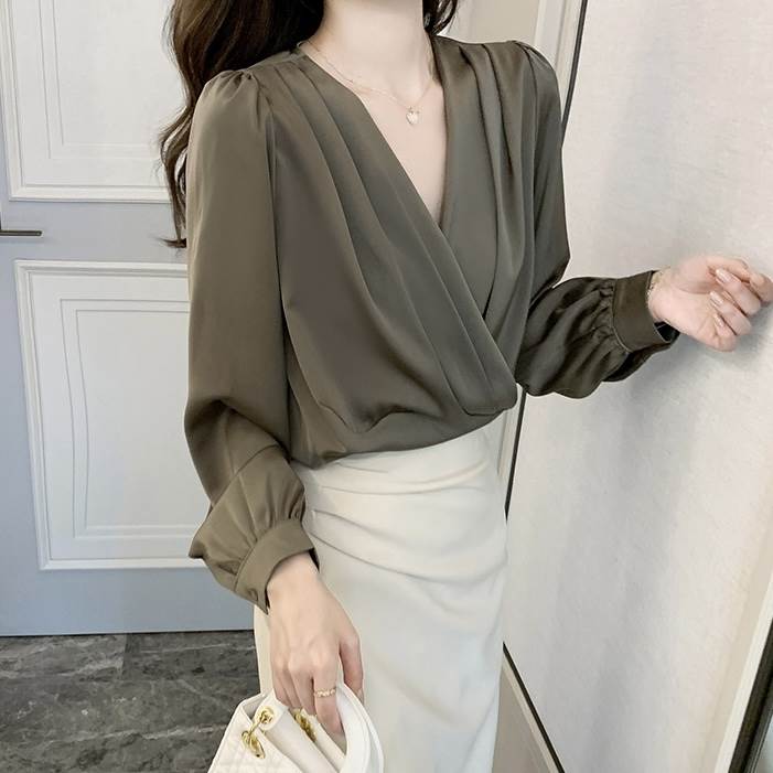 トップス シャツ レギュラー丈 袖あり 長袖 Vネック 襟なし ルーズ ストレート プリーツ プルオーバー 薄手 サテン 大人可愛い きれいめ 上品 お洒落 かっこいい レトロ 大人女子 こなれ感 クール モード系 セクシー エレガント モダン 主役級 無地 春 20代 30代 40代 50代 レディース オフィス OL 通勤 お出かけ パーティー イベント レストラン 着回し 韓国系 オルチャン ファッション コーデ スタイル モテ トレンド 流行 S M L XL 2XL ホワイト ブラック カーキ