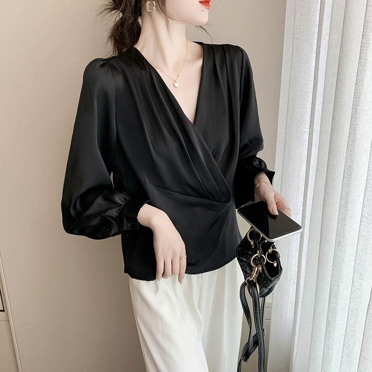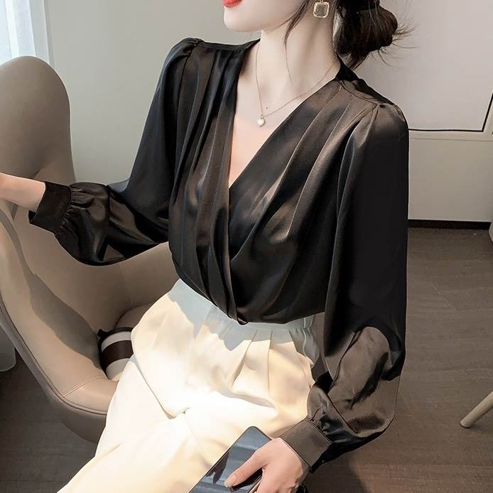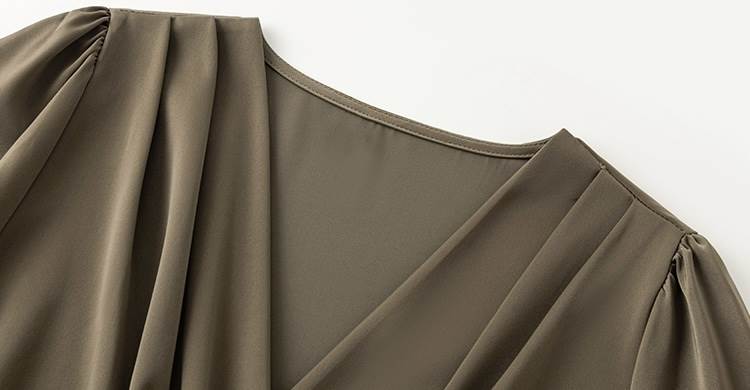 トップス シャツ レギュラー丈 袖あり 長袖 Vネック 襟なし ルーズ ストレート プリーツ プルオーバー 薄手 サテン 大人可愛い きれいめ 上品 かっこいい レトロ クール モード系 セ 大人女子