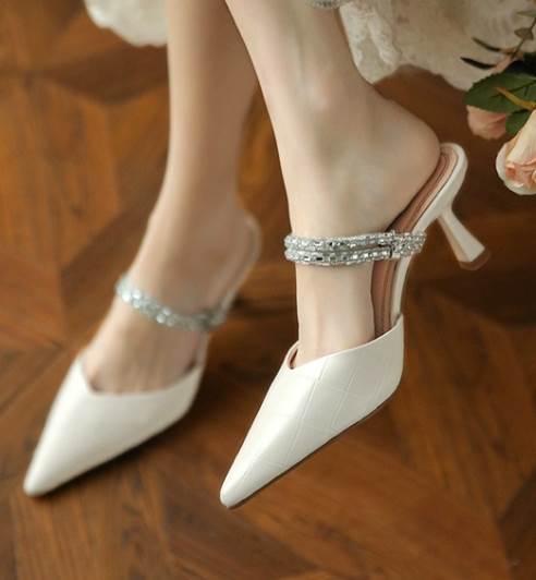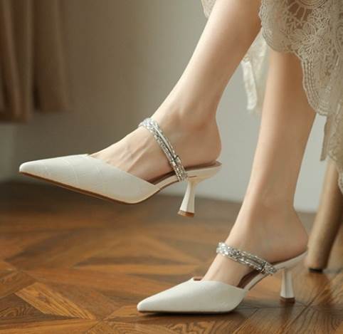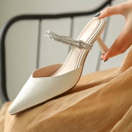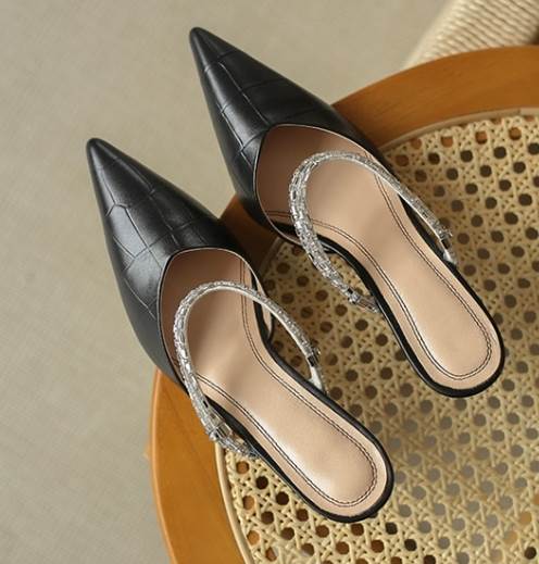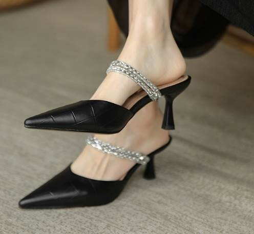 レディース ミュール ハイヒール 6.5cm ポインテッドトゥ ストラップ 美脚 脚長 ラインストーン レザー 大人可愛い きれいめ シンプル 上品 おしゃれ エレガント キュート クール かっこいい