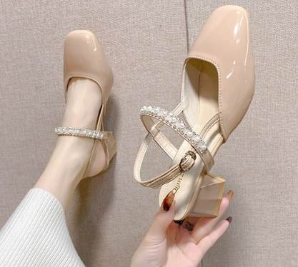 レディース ミュール ストラップシューズ 太ヒール チャンキーヒール 4.5cm ラウンドトゥ ストラップ ベルト パール ビジュー 美脚 かわいい 大人可愛い 上品 おしゃれ エレガント きれいめ