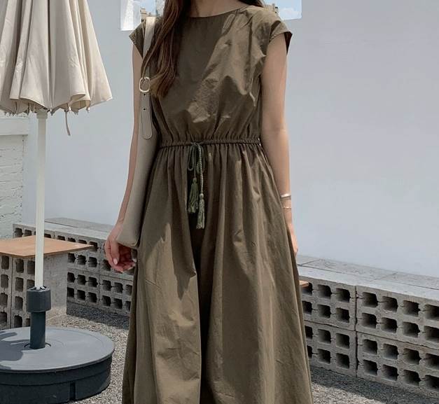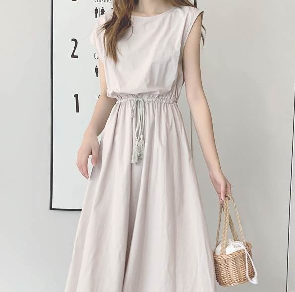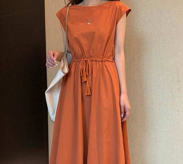 ラウンドネックとウエストマークが女性らしさを引き立て、大人可愛いスタイルにもぴったりです。