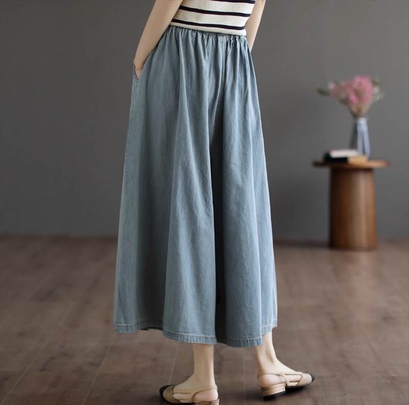 デニムのガウチョパンツで、トレンド感と快適な穿き心地を叶えてみませんかカジュアルからきれいめまで、様々なスタイルに合わせられるので、1枚持っていると重宝すること間違いなしです。ワイドなシルエットで体型カバーも叶えられますよ。デニム生地なので、カジュアルなデートや休日のお出かけにもぴったりです。