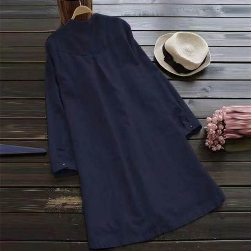 ワンピース ミドル丈 袖あり 長袖 ラウンドネック ルーズ Aライン ポケット プルオーバー 綿 麻 薄手 コットン 大人可愛い きれいめ シンプル カジュアル 大人 かっこいい レトロ 大人女 上品