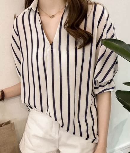 トップス シャツ プルオーバー ロング 半袖 Vネック シフォン かわいい シンプル カジュアル おしゃれ こなれ感 ラフ クール ストライプ 春 夏 秋 10代 30代 レディース ストレー 20代