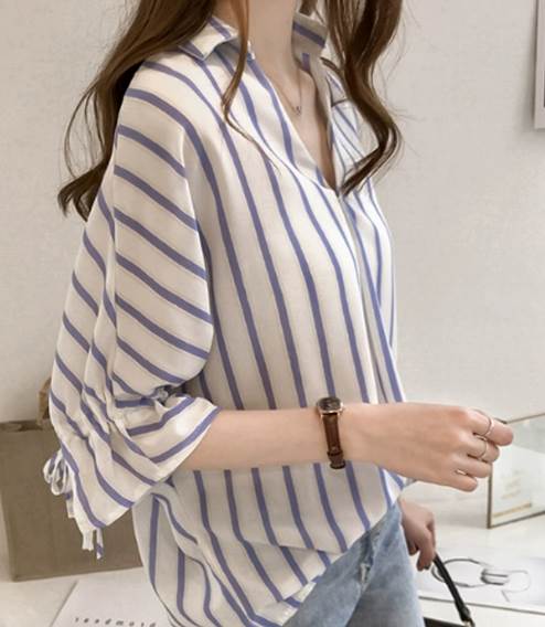 ゆったりとしたシルエットと袖口のくしゃっとしたデザインが可愛いシフォンシャツ。爽やかな色味太めのストライプが夏にぴったりです。デニムやショートパンツなど、パンツスタイルとの相性が抜群。ネックレスやブレスレットなどアクセサリーを足したり、日除けも兼ねて防止を被っても可愛いです。