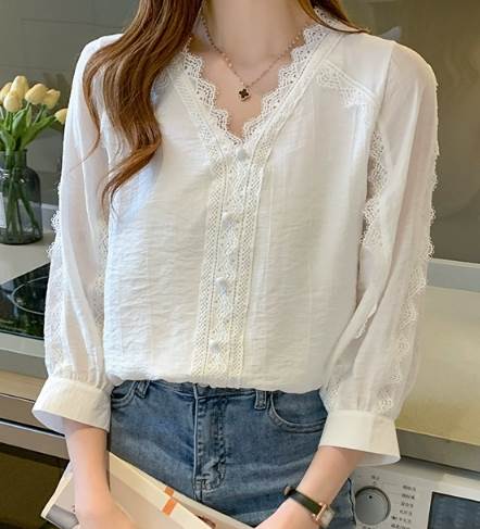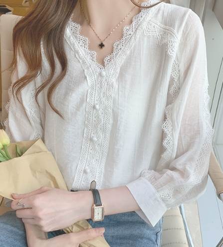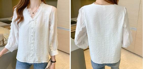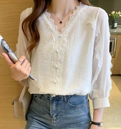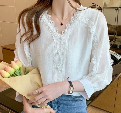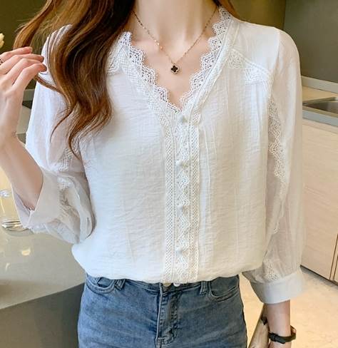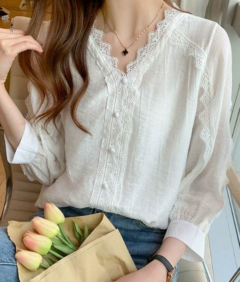 繊細なレースが上品な七分袖シャツ。首元、肩から袖にかけてのレースがとてもエレガントでおしゃれです。清潔感のあるアイテムなので、ブルー系の爽やかなボトムスと相性抜群。デニム素材などのしっかりとした生地の物もよく合います。足元にヒールのある靴を持ってくるとコーディネートが締まります。