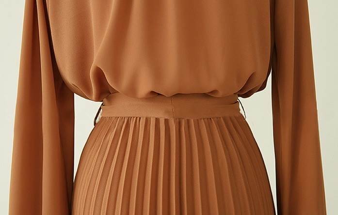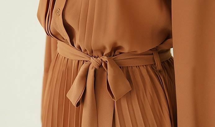 レディース ワンピース ロング 長袖 バンドカラー Aライン プリーツ シフォン ウエストマーク ウエストリボン かわいい 大人可愛い きれいめ シンプル 上品 レトロ エレガント モダン おしゃれ