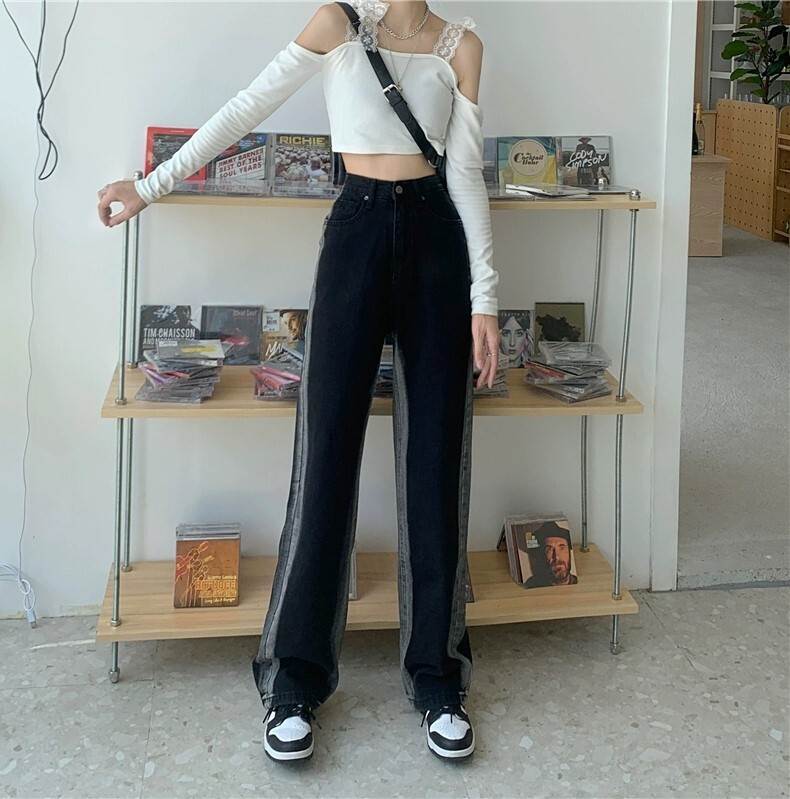 ブラックデニムでよりクールな印象を与え、ハイウエストで脚長効果を演出。
