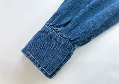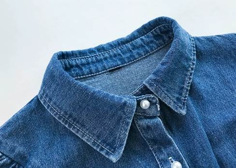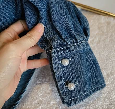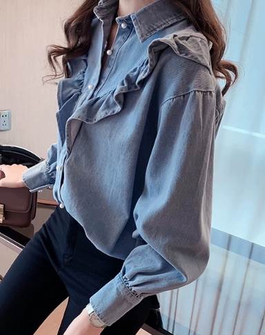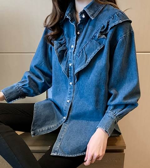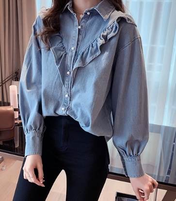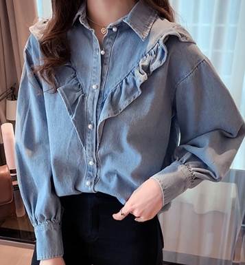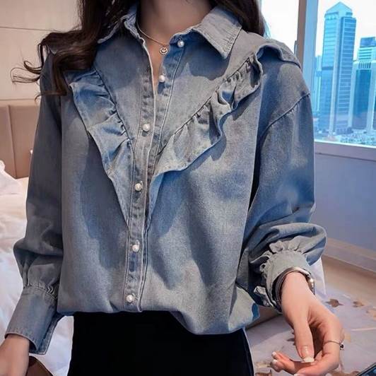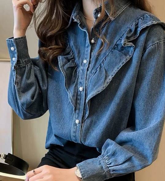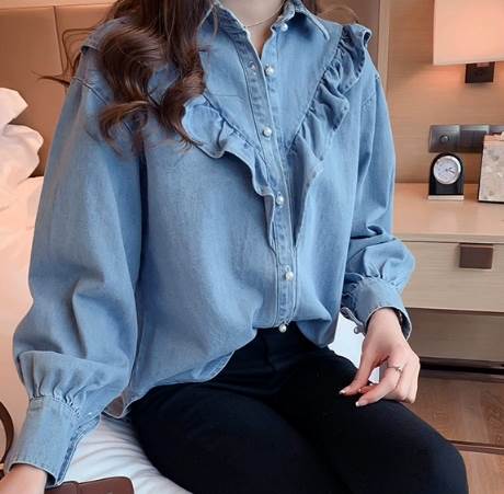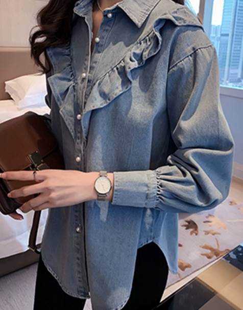 レディース トップス シャツ 長袖 ボリューム袖 襟付き 角襟 ストレート フリル パールボタン デニム かわいい 大人 カジュアル 上品 おしゃれ 個性的 エレガント 存在感 春 秋 10代 無地