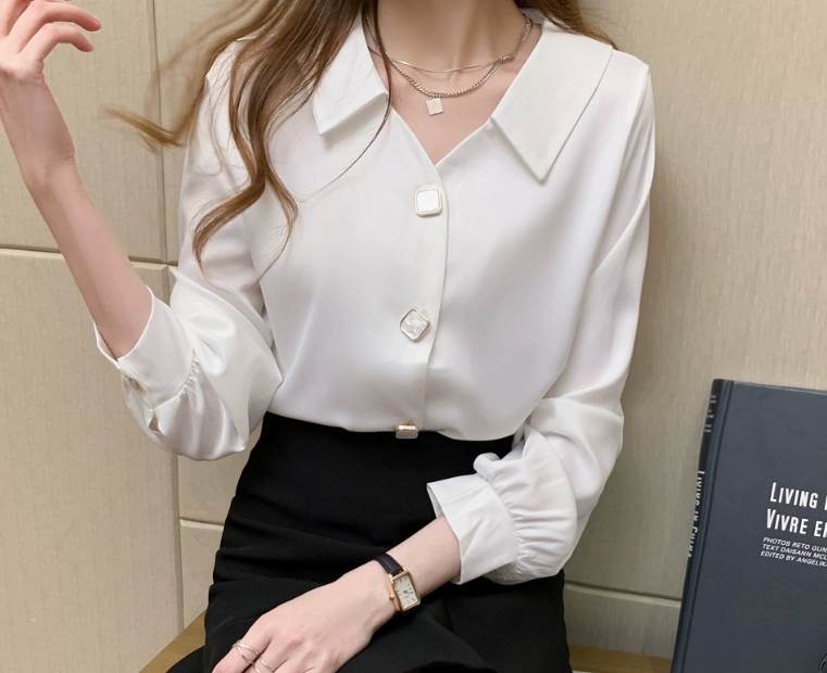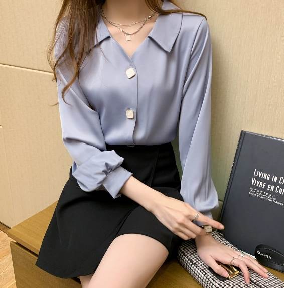 トップス シャツ シフォン 長袖 襟付き Vネック 前開き デザインボタン かわいい きれいめ シンプル 大人 上品 おしゃれ かっこいい レトロ こなれ感 クール 個性的 存在感 無地 オー 主役級