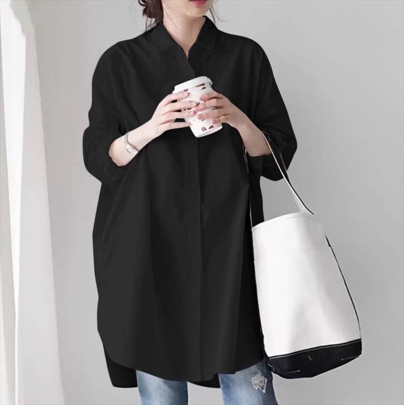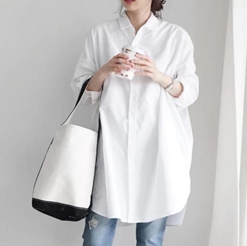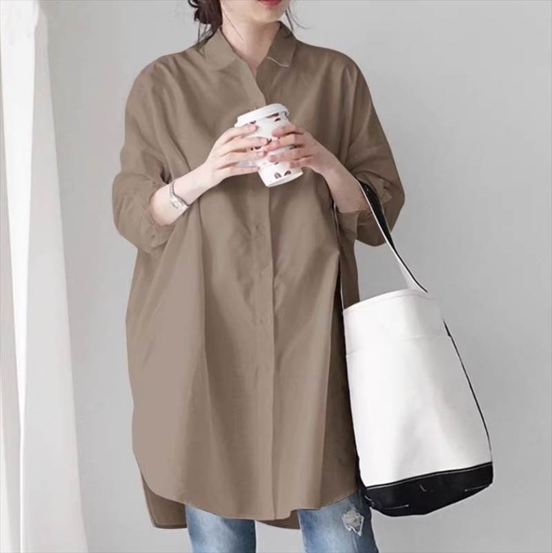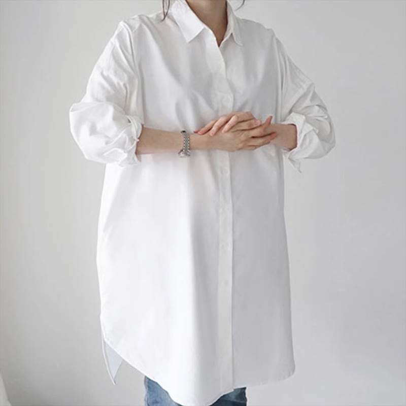 ルーズなシルエットが女性らしさを引き立てるロング丈シャツ。お尻まですっぽりと包み込むデザインで、体型カバーもバッチリです。Vネックと襟付きのデザインが、女性らしさと上品さを演出します。シンプルでありながら、カジュアルからきれいめまで、様々なスタイリングに合わせることができます。