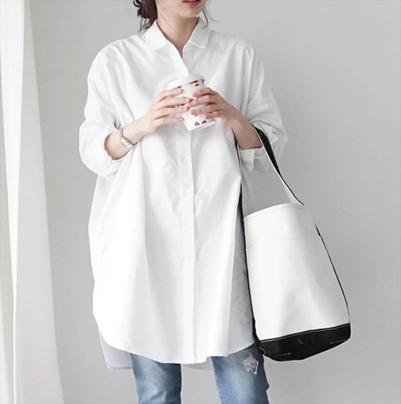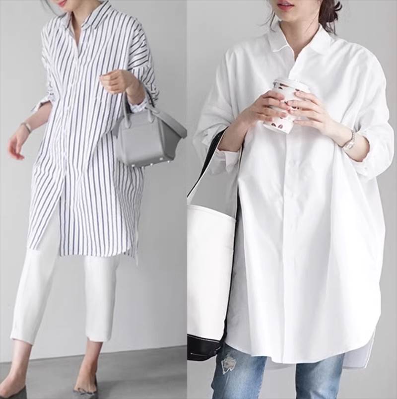 レディース トップス シャツ ロング お尻まですっぽり 長袖 Vネック 襟付き ストレート 前開き かわいい 大人可愛い きれいめ シンプル カジュアル 上品 おしゃれ かっこいい メンズライク クール 無地 ストライプ 春 秋 OL デート お出かけ 体型カバー 普段使い 着回し レイヤード 定番 S M L XL 2XL 白 ホワイト 黒 ブラック 茶色 ブラウン