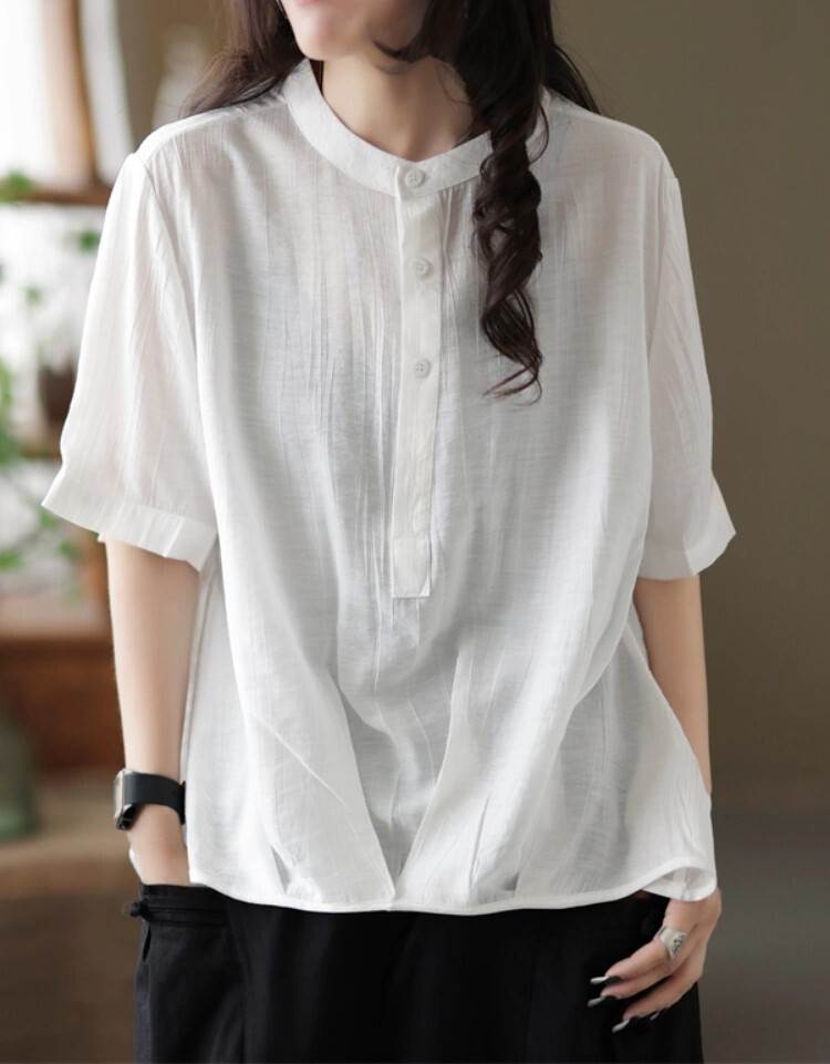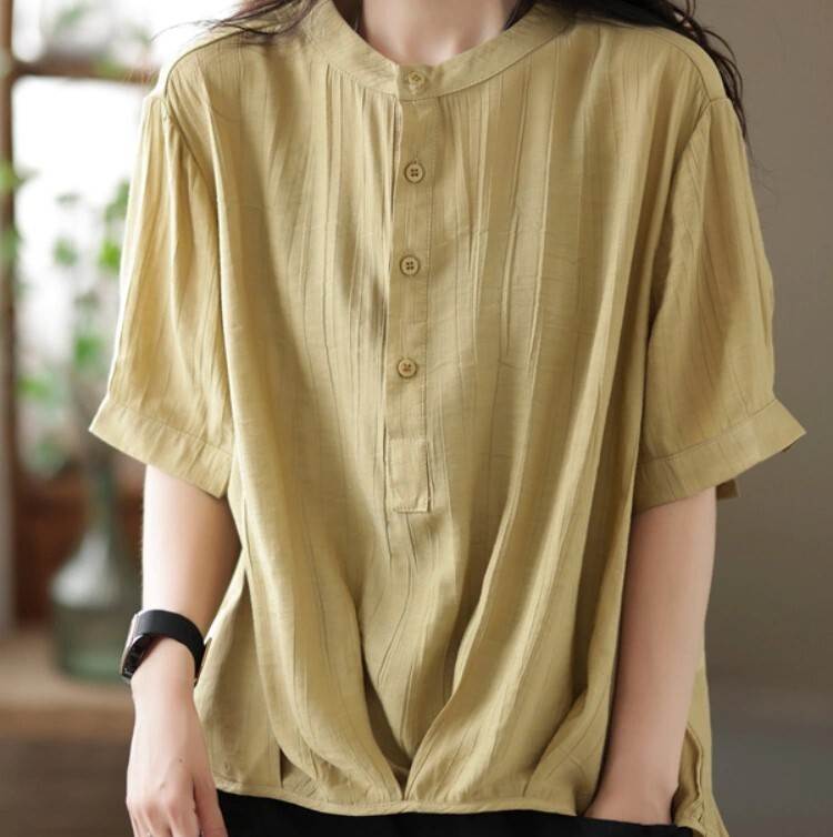 トップス シャツ ブラウス ドレープ 袖あり 半袖 五分袖 ラウンドネック 襟なし 薄手 かわいい きれいめ シンプル カジュアル 大人 上品 おしゃれ 大人可愛い こなれ感 都会的 ラフ 大人女子