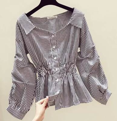 シャーリング トップス シャツ 長袖 ボリューム袖 Vネック 襟付き フレア ウエストマーク かわいい きれいめ シンプル カジュアル 大人 上品 おしゃれ モダン 存在感 ストライプ 春 秋 無地