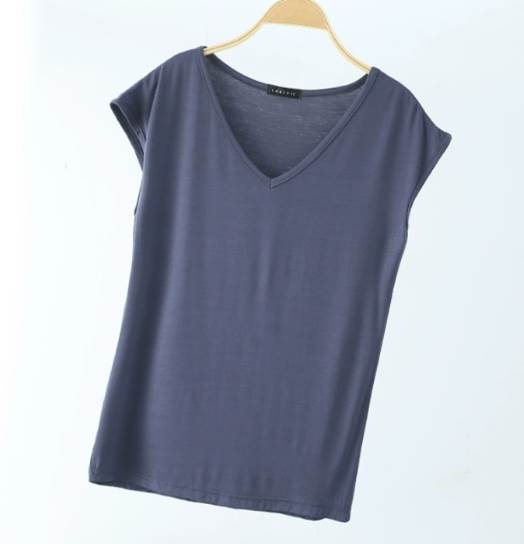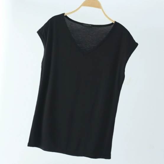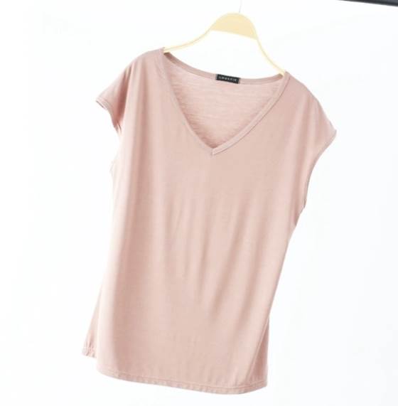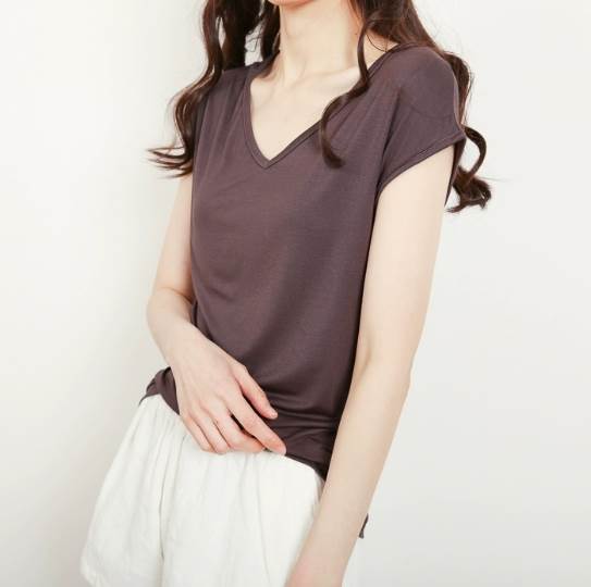 Vネックでデコルテラインがキレイに見え、袖丈もちょうど良い長さが、ほどよく体型カバーをしてくれます。